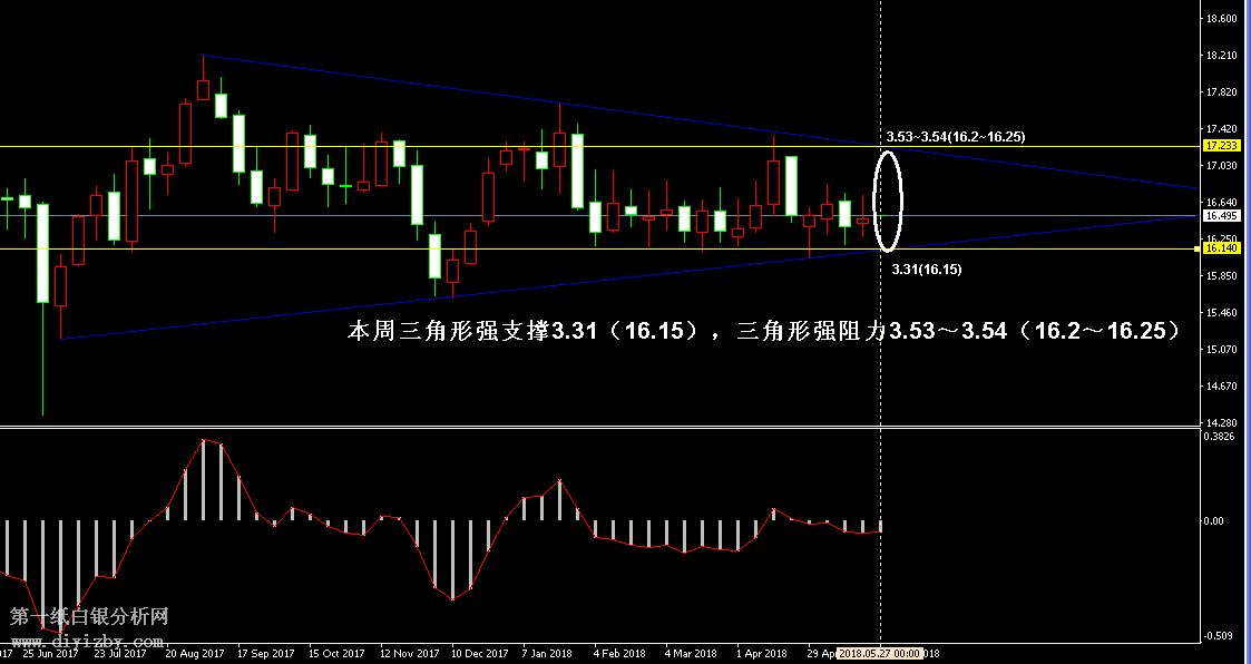 白銀短線策略:(波段:持倉觀望;短線:高拋低吸)。 從周線形態來看,白銀不僅僅處于大震蕩區間3.28~3.56(16~17.35)內波動,更處于收縮三角形內震蕩,而本周三角形繼續縮窄后,銀價恐仍難以脫離震蕩區間,周內走勢繼續維持震蕩的概率極大。如下圖所示為白銀周線走勢圖,圖中藍線所示為周線上升趨勢線和下跌趨勢線所形成的三角形形態,隨著每周時間推移,該三角形的波動范圍將越來越小。本周三角形支撐位于3.31(16.15)附近,三角形阻力位于3.53~3.54(16.2~16.25)附近,上述支撐和阻力基本于震蕩區間的強支撐與強阻力重合,因此周內銀價觸及上述點位,投資者可對應支撐和阻力重點進行高拋低吸。由于該收縮三角形范圍隸屬于震蕩區間,因此周內投資者可先重點關注三角形范圍,在三角形兩端進行重點的高拋低吸策略。