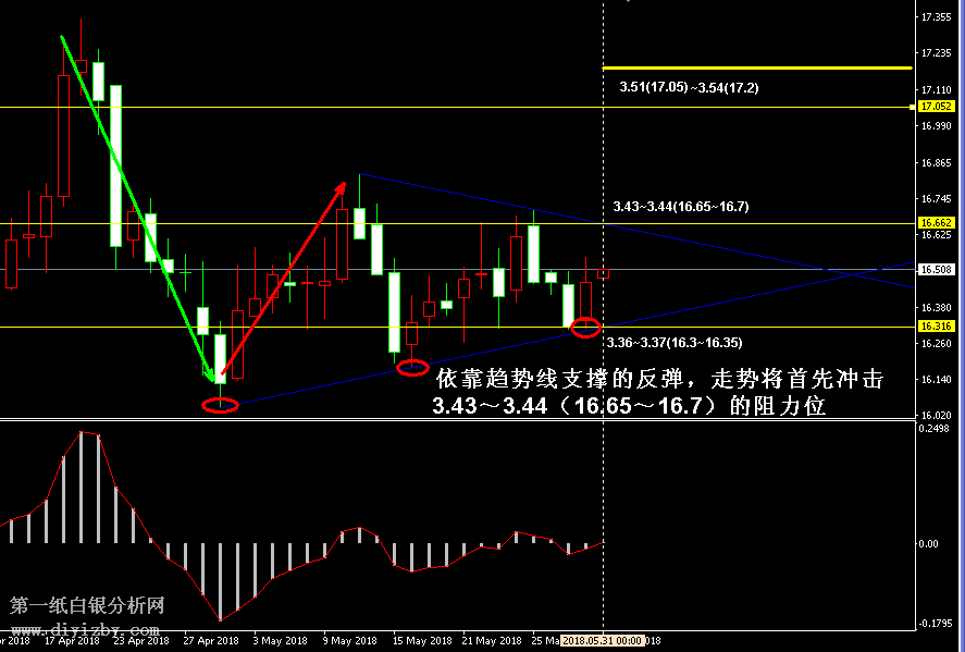 今日下方關鍵支撐3.36~3.37(16.3~16.35)、3.31~3.33(16.1~16.2)、3.29(16);今日上方關鍵阻3.43~3.44(16.65~16.7)、3.51~3.55(17.05~17.25)、3.57(17.35)。 提示:技術僅僅是基于概率論和統計學的一種綜合分析手段,絕非預測。所以技術分析是在考慮做好止損的情況下去博取大概率事件,投資不可過于迷信技術分析。(短線操作請一定做好止損,一旦被損,代表分析師基于概率和統計的技術分析不適用于當前行情) 另外,由于紙白銀價格是國際銀價換算而來,而換算過程中涉及到人民幣對美元匯率的變化,即使在國際銀價不變化的情況下,如果人民幣貶值或升值,也會導致紙白銀價格出現變動。因此,我們的分析只采用最新的國際銀價對應的人民幣白銀價格,如與過去分析價格有出入, 投資者應知曉其原因。 1、文中價格為紙白銀價格,括號內為國際銀價,投資者可雙向參考。 2、以上所有價格為工商銀行買入價,即紙白銀低價。進倉點位要再加點差(各銀行點差不一),出倉則不要。 3、第一紙白銀給出的所有建議僅供投資者參考,不作為下單絕對依據,切勿過于依賴。 4、北京時間09:00發布此文章。 5、上一交易日白銀價格分析情況:(5月30日)白銀震蕩形態未改變 回踩支撐走勢或反彈