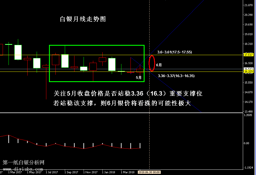白銀短線策略:(波段:持倉觀望;短線:高拋低吸)。 今日白銀月線將收官,其收線情況將在一定程度上反映出6月走勢的波動強弱。從目前白銀月線走勢圖來分析,圖中綠色框顯示在過去一年時間內,走勢基本處于橫盤整理的狀態,長期走勢中,投資者可關注未來銀價對于近一年內高點低點的突破情況,這將決定銀價的長期趨勢是展開拉升或是下跌。不過,今日投資者應關注的是5月收盤價格,即今日收盤價格。圖中藍線所示為月線切線延伸段在6月的支撐和阻力,其支撐在3.36~3.37(16.3~16.35)附近,阻力在3.6~3.61(17.5~17.55)附近。這暗示,若5月白銀收盤在3.36(17.3)上方后,6月走勢將走出看漲的形態,最終6月走勢將在圖中紅色圈所示的范圍3.36~3.61(16.3~17.55)內運行;反之,若5月收盤價格不佳,今日銀價跌破3.36(16.3),則6月銀價將處于藍線下方運行,這暗示6月行情將繼續下跌。故而今日投資者可重點關注3.36(16.3)的守穩情況,巧合的是,該點位同時也是上圖所示的短期趨勢線支撐位,具有極為重要的意義。