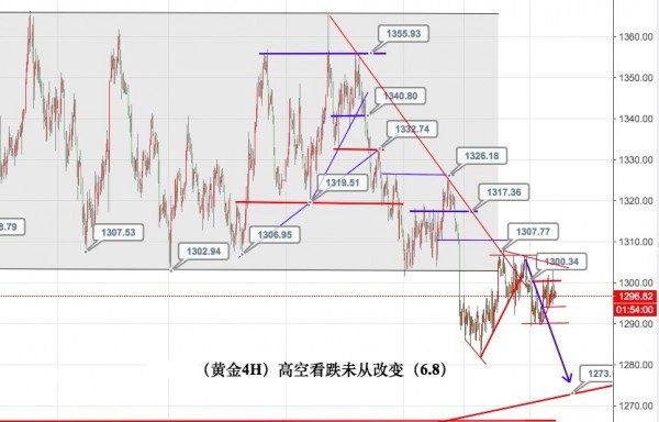 隔夜亞歐盤震蕩后,美盤再度走了一波沖高回撤的行情,雖然沖破了1301的防守,但最終的收盤依然在1301之下,由此可見主力持續抗跌且沖高更大的目的依然是誘多殺空!美元的回撤觸及到93關口,而黃金卻依然未能企穩1301和1308的阻力,所以后市的行情我們依然堅守高空的策略不變,經歷了隔夜的再度洗盤,預期下跌不會在等太久!