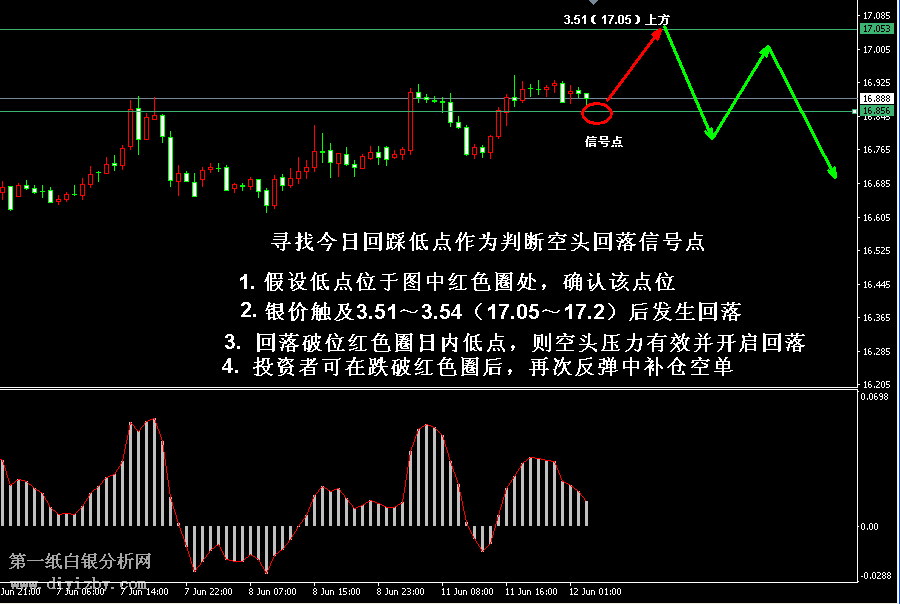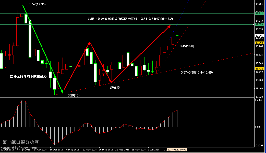 今日下方關鍵支撐3.37~3.38(16.4~16.45)、3.31~3.33(16.1~16.2)、3.29(16);今日上方關鍵阻3.51~3.54(17.05~17.2)、3.57(17.35)。 提示:技術僅僅是基于概率論和統計學的一種綜合分析手段,絕非預測。所以技術分析是在考慮做好止損的情況下去博取大概率事件,投資不可過于迷信技術分析。(短線操作請一定做好止損,一旦被損,代表分析師基于概率和統計的技術分析不適用于當前行情) 另外,由于紙白銀價格是國際銀價換算而來,而換算過程中涉及到人民幣對美元匯率的變化,即使在國際銀價不變化的情況下,如果人民幣貶值或升值,也會導致紙白銀價格出現變動。因此,我們的分析只采用最新的國際銀價對應的人民幣白銀價格,如與過去分析價格有出入, 投資者應知曉其原因。 1、文中價格為紙白銀價格,括號內為國際銀價,投資者可雙向參考。 2、以上所有價格為工商銀行買入價,即紙白銀低價。進倉點位要再加點差(各銀行點差不一),出倉則不要。 3、第一紙白銀給出的所有建議僅供投資者參考,不作為下單絕對依據,切勿過于依賴。 4、北京時間09:00發布此文章。 5、上一交易日白銀價格分析情況:(6月11日)白銀反彈趨勢延續 多頭占優將沖擊大阻力