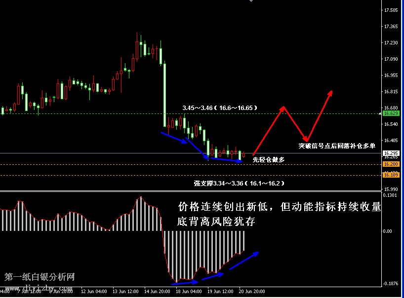 今日下方關鍵支撐3.34~3.36(16.1~16.2)、3.32(16);今日上方關鍵阻3.48(16.75)、3.54~3.57(17.05~17.2)、3.6(17.35)。 提示:技術僅僅是基于概率論和統計學的一種綜合分析手段,絕非預測。所以技術分析是在考慮做好止損的情況下去博取大概率事件,投資不可過于迷信技術分析。(短線操作請一定做好止損,一旦被損,代表分析師基于概率和統計的技術分析不適用于當前行情) 另外,由于紙白銀價格是國際銀價換算而來,而換算過程中涉及到人民幣對美元匯率的變化,即使在國際銀價不變化的情況下,如果人民幣貶值或升值,也會導致紙白銀價格出現變動。因此,我們的分析只采用最新的國際銀價對應的人民幣白銀價格,如與過去分析價格有出入, 投資者應知曉其原因。 1、文中價格為紙白銀價格,括號內為國際銀價,投資者可雙向參考。 2、以上所有價格為工商銀行買入價,即紙白銀低價。進倉點位要再加點差(各銀行點差不一),出倉則不要。 3、第一紙白銀給出的所有建議僅供投資者參考,不作為下單絕對依據,切勿過于依賴。 4、北京時間09:00發布此文章。 5、上一交易日白銀價格分析情況:(6月20日)白銀考驗三角形下沿 關注強支撐反彈力度