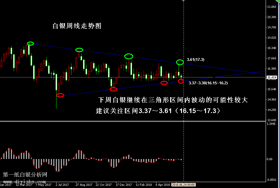 目前白銀價(jià)格是3.434克(16.414美元)。本周銀價(jià)先跌后漲,在觸及震蕩區(qū)間強(qiáng)支撐和周線三角形下沿后,走勢迎來了反彈行情,一方面說明銀價(jià)當(dāng)前所處的格局仍然為震蕩區(qū)間內(nèi)波動(dòng),另一方面說明在區(qū)間強(qiáng)支撐附近再次發(fā)生了多空力量轉(zhuǎn)變的情況。如下圖所示為白銀周線走勢圖,圖中藍(lán)線所示為在過去一年時(shí)間里白銀高點(diǎn)和低點(diǎn)所形成的下跌趨勢線和上升趨勢線,該趨勢線的效力非常明顯,在過去幾個(gè)月的震蕩行情中,走勢一直處于上述趨勢線所形成的“收縮三角形”范圍內(nèi)震蕩。上周銀價(jià)曾一度拉升至三角形上沿阻力,但最終未能突破,并遭遇了明顯的空頭拋壓,銀價(jià)從下跌趨勢線開始大幅回落。直至本周,走勢一度連續(xù)下跌,但最終回踩了三角形下沿支撐后,銀價(jià)開啟了反彈行情。可以看出,當(dāng)前走勢正圍繞圖中“收縮三角形”形態(tài)來回波動(dòng),而該三角形在過往行情中對于銀價(jià)的影響亦非常明顯,綠色圈說明走勢在過去多次拉升中都遭遇了強(qiáng)壓影響,最終未能突破;紅色圈說明走勢在過去多次下跌中都遭遇了強(qiáng)買盤支撐,未能跌破。由于隨著時(shí)間推移,收縮三角形的波動(dòng)區(qū)間越來越窄,這也限制了在2018年以來,走勢大部分時(shí)間都處于區(qū)間震蕩的緣故。一方面投資者可堅(jiān)持在收縮三角形的兩端進(jìn)行高拋低吸,另一方面應(yīng)時(shí)刻關(guān)注三角形的突破情況,一旦突破后,銀價(jià)將有望順勢突破當(dāng)前的大震蕩區(qū)間3.34~3.62(16~17.35),這將為下一步趨勢行情指明方向。下周三角形下沿支撐將緩慢上移至3.37~3.38(16.15~16.2)附近,上沿阻力將緩慢下移至3.61(17.3)附近,上述支撐和阻力仍然隸屬于大區(qū)間3.34~3.62(16~17.35)范圍內(nèi),故而推測走勢繼續(xù)震蕩的可能性極大,投資者應(yīng)在上述支撐和阻力進(jìn)行高拋低吸,嚴(yán)格止損大震蕩區(qū)間外沿。值得注意的是,目前價(jià)格正靠近三角形下沿支撐附近,故而下周初投資者應(yīng)先嘗試回落做多的思路,等待銀價(jià)反彈遇阻后再嘗試反手做空。雖然近期走勢連續(xù)下跌,但從形態(tài)上來分析,銀價(jià)并未轉(zhuǎn)入下跌趨勢,也未能向下打開空間,在走勢跌破震蕩區(qū)間之前,投資者絕不可過分看空。綜合分析,近兩周的走勢正是在圖中收縮三角形的上沿和下沿來回波動(dòng),上周銀價(jià)沖擊綠色圈所示的上沿壓力而回落,本周走勢又回踩了紅色圈所示的下沿支撐而反彈。下周開盤后,銀價(jià)仍將處于三角形范圍內(nèi)波動(dòng),且非常靠近三角形下沿支撐3.37~3.38(16.15~16.2),投資者可圍繞該支撐上方布局多單,止損在震蕩區(qū)間底部3.34(16)下方。除非銀價(jià)跌破3.34(16),否則行情不能向下打開空間,此時(shí)走勢的反彈意圖和空間將更大(看至區(qū)間上沿阻力)。投資者應(yīng)先做多,等待反彈后再做空,保持區(qū)間內(nèi)來回高拋低吸的思路。(注: 由于紙白銀價(jià)格是國 際銀價(jià)換算而來,而換算過程中涉及到人民幣對美元匯率的變化,即使在國際銀價(jià)不變化的情 況下,如果人民幣貶值或升值,也會(huì)導(dǎo)致紙白銀價(jià)格出現(xiàn)變動(dòng)。因此,我們的分析只采用最新 的國際銀價(jià)對應(yīng)的人民幣白銀價(jià)格,如與過去分析價(jià)格有出入, 投資者應(yīng)知曉其原因。)