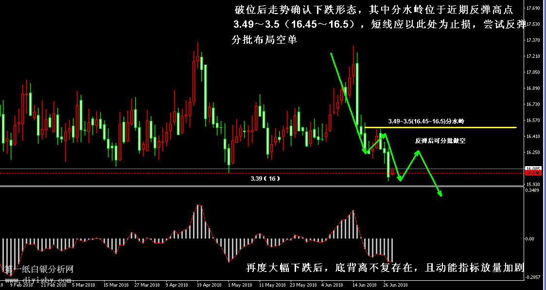 目前白銀價格是3.411元/克(16.083美元/盎司)。昨日銀價大幅下跌,走勢最終向下破位了3.39(16)的震蕩區間低點并完成了方向選擇,在底背離和強支撐的影響下,白銀都未能獲得強力的反彈行情,這說明空頭力量仍然占據優勢,而隨著昨日走勢下破震蕩區間后,銀價已經完成了“震蕩-->空頭趨勢”的轉變,這說明此時的賣盤力量較之前有所增強,行情繼續下跌的風險將增大,投資者應開始分批反手做空。如下圖所示為白銀日線走勢圖,圖中紅色虛線為震蕩區間的底部位置3.39(16)附近,昨日行情大幅下跌后微破了該底部,盡管跌破幅度不大,但銀價破位后走勢已經確認了圖中綠色箭頭所示的下跌形態,此時的下跌浪中高點低點均呈現出不斷下移的狀態,完全符合下跌趨勢的特征。在昨日銀價向下破位區間后,原本存在的日線底背離形態亦被強行修復,動能指標進一步在零軸下方放量,這說明隨著走勢跌破震蕩區間后,空頭力量有逐漸增強的跡象,這暗示近期的下跌行情恐將持續。由于近期反彈高點位于3.49~3.5(16.45~16.5)附近,此處是多頭近期最強一次反彈,也是下跌趨勢的前浪高點,若趨勢延續,則走勢再次反彈后也不會突破該點位,故而投資者可以3.49~3.5(16.45~16.5)為短線下跌趨勢的止損點和分水嶺,銀價在不突破此處之前,走勢將呈現出持續下行的態勢,投資者可嘗試反彈分批做空,其中在3.45(16.25)、3.47(16.35)分批做空,統一止損3.5(16.5)上方。值得注意的是,目前白銀僅僅剛剛跌破震蕩區間,若走勢反彈,仍然處于最佳的布局空單的時機,采取上述分批做空策略后需嚴格止損分水嶺3.5(16.5)上方,止損點和風險較小,利潤則下看至3.35(15.8)、3.26(15.25)。綜合分析:雖然昨日走勢微破了震蕩區間,但形態上已經形成了下跌趨勢,投資者可先以輕倉做空的思路應對,嚴格止損3.5(16.5)分水嶺上方。若走勢二次破位3.39(16)后,屆時在反彈中可重復加倉空單并擴大倉位;反之,若近期走勢向上突破分水嶺3.5(16.5),則可確認昨日走勢微破3.39(16)的行情為假突破。不過此時,投資者不可評估該破位的真假性,單從動能指標和趨勢形態來看,走勢確實轉入空頭格局,建議先以輕倉做空應對,在止跌企穩之前暫不可盲目做多。