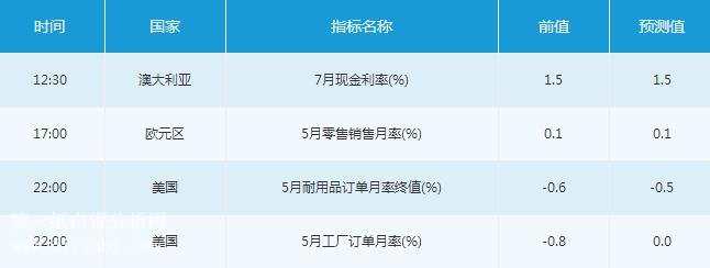 周二(7月3日)亞洲時段,投資者需關注12:30澳洲聯儲將公布利率決議。歐洲時段,投資者需關注17:00公布的歐元區5月零售銷售月率。美國時段,投資者需關注22:00公布的美國5月耐用品訂單月率終值、美國5月工廠訂單月率。