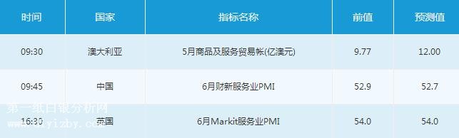 周三(7月4日)投資者需主要關注09:30公布的澳大利亞5月商品及服務貿(mào)易帳、09:45公布的中國6月財新服務業(yè)PMI、16:30公布的英國6月Markit服務業(yè)PMI。此外,周三為獨立日,紐約證券交易所,休市一天。
