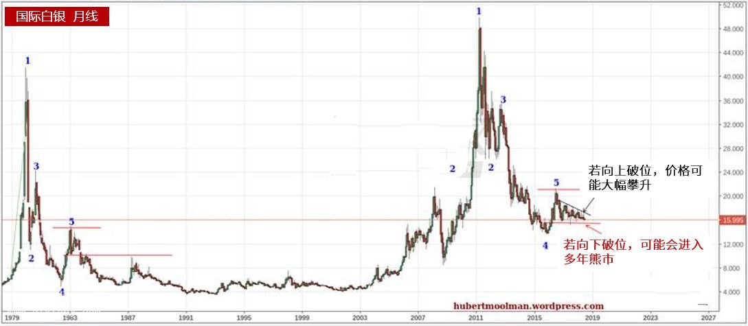 如果重演1980年代初的走勢,白銀之后可能會進入一段長期熊市。但是,倘若當前走勢偏離1983年時的模式,價格升至圖中點5水平之上,則將恢復生機勃勃的牛市。 在短期牛市的情境下,價格需要突破旗型或三角形上軌,并避免跌破下方紅色水平線。若價格突破點5水平,則有很大機會會迎來類似于2010年的反彈。 從基本面角度來看,目前白銀要跌入熊市的障礙有很多,其中主要的一個障礙是與1980年代截然不同的經濟環境(利率方面)。 1980年代點5的位置在主要利率觸及峰值之后形成,而當前階段點5的形成是在主要利率觸底之后。當前的環境有利于白銀上漲。 綜上,Hubert Moolman認為,與下跌相比,白銀后市更有可能上漲,牛市將很快到來。 查看更多紙白銀相關新聞請看:紙白銀行情新聞