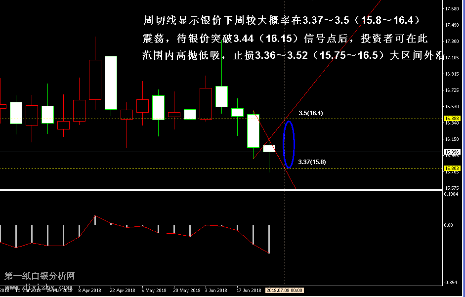 目前白銀價格是3.418克(15.996美元)。本周銀價仍然延續跌勢,雖然觸及中線第一支撐位3.37(15.8)后出現反彈,但走勢的反彈力度極為疲軟,未能向上突破短線信號點3.44(16.15),行情目前為止仍未走出止跌企穩的形態,下周投資者可繼續密切關注3.44(16.15)的突破情況,一旦銀價破位該點位,則短線行情將進入弱勢震蕩格局,屆時投資者可首先在區間3.36~3.52(15.75~16.5)范圍內高拋低吸。如下圖所示為白銀周線走勢圖,圖中紅線所示為周切線的延伸段在下周的支撐和阻力,其中支撐位在3.37(15.8)附近,這與中線支撐相重合,暗示下周白銀在該點位仍將受到較大的買盤力量;阻力位在3.5(16.4)附近,此處同樣也是日線的強壓區域,且屬于日線分水嶺3.52(16.5)突破前的最后一道阻力位,預計有較強的空頭壓力。純技術面顯示,下周白銀在無消息刺激的情況下,預計走勢較大概率將在3.37~3.5(15.8~16.4)的范圍內震蕩。不過就目前短線而言,由于走勢尚未突破3.44(16.15)的止跌信號點,雖然形態上支持下周走勢震蕩,但動能指標尚未驗證多頭力量增強,而趨勢當下還未發生改變,故而建議下周投資者應首先關注3.44(16.15)的突破,突破此處后,投資者可嘗試在上述區間3.37~3.5(15.8~16.4)內進行高拋低吸。突破之前應先保持觀望,靠近3.37(15.8)附近僅可輕倉試盤做多,嚴格止損3.36(15.75)下方。值得注意的是,3.44(16.15)為短線銀價的止跌企穩信號點,突破此處后,代表超短線行情陷入了弱勢震蕩格局,但日線走勢和周線形態仍然沒有改變此前的下跌趨勢,后市需以3.52(16.5)的突破,作為進一步判斷日線走勢轉入震蕩的信號。一旦銀價在后市突破3.52(16.5)后,白銀的日線形態有望重新回歸大震蕩區間,繼而行情有希望再度向上沖擊此前未能突破的高點3.7(17.35)。綜合分析,由于目前各個趨勢中白銀均處于弱勢下跌,銀價若要在各個趨勢都完成止跌企穩,并非一朝一夕或一次反彈所能決定。投資者可先參考短線周期的止跌信號3.44(16.15),進而再參考日線走勢的止跌信號3.52(16.5)。根據不同周期止跌后,投資者可嘗試進行短線操作和波段操作。另外,銀價止跌企穩后,并非進入新的上漲趨勢,而是重新轉入了震蕩行情,屆時多空力量較為均衡,投資者應確定震蕩區間后進行高拋低吸策略。(注: 由于紙白銀價格是國 際銀價換算而來,而換算過程中涉及到人民幣對美元匯率的變化,即使在國際銀價不變化的情 況下,如果人民幣貶值或升值,也會導致紙白銀價格出現變動。因此,我們的分析只采用最新 的國際銀價對應的人民幣白銀價格,如與過去分析價格有出入, 投資者應知曉其原因。)
