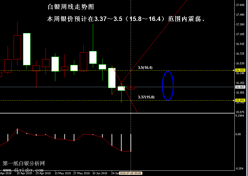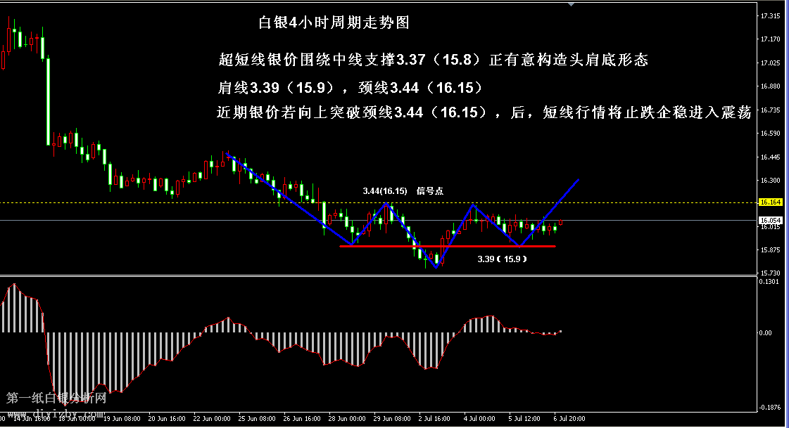 今日下方關(guān)鍵支撐3.37(15.8)、3.25(15.25);今日上方關(guān)鍵阻3.44(16.15)、3.52(16.5)、3.57(16.75)、3.63~3.66(17.05~17.2)、3.7(17.35)。 提示:技術(shù)僅僅是基于概率論和統(tǒng)計學(xué)的一種綜合分析手段,絕非預(yù)測。所以技術(shù)分析是在考慮做好止損的情況下去博取大概率事件,投資不可過于迷信技術(shù)分析。(短線操作請一定做好止損,一旦被損,代表分析師基于概率和統(tǒng)計的技術(shù)分析不適用于當(dāng)前行情) 另外,由于紙白銀價格是國際銀價換算而來,而換算過程中涉及到人民幣對美元匯率的變化,即使在國際銀價不變化的情況下,如果人民幣貶值或升值,也會導(dǎo)致紙白銀價格出現(xiàn)變動。因此,我們的分析只采用最新的國際銀價對應(yīng)的人民幣白銀價格,如與過去分析價格有出入, 投資者應(yīng)知曉其原因。 1、文中價格為紙白銀價格,括號內(nèi)為國際銀價,投資者可雙向參考。 2、以上所有價格為工商銀行買入價,即紙白銀低價。進倉點位要再加點差(各銀行點差不一),出倉則不要。 3、第一紙白銀給出的所有建議僅供投資者參考,不作為下單絕對依據(jù),切勿過于依賴。 4、北京時間09:00發(fā)布此文章。 5、上一交易日白銀價格分析情況:(7月6日)白銀反彈疲軟仍未止跌 非農(nóng)數(shù)據(jù)將指引方向