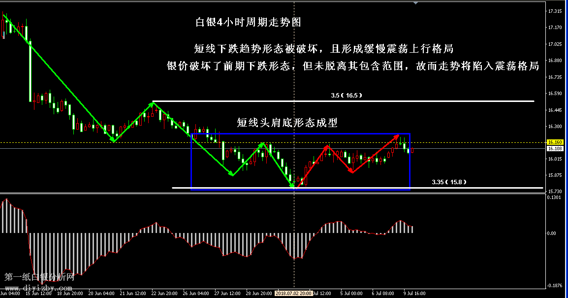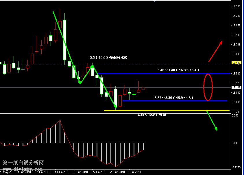 今日下方關(guān)鍵支撐3.37(15.8)、3.25(15.25);今日上方關(guān)鍵阻3.44(16.15)、3.52(16.5)、3.57(16.75)、3.63~3.66(17.05~17.2)、3.7(17.35)。 提示:技術(shù)僅僅是基于概率論和統(tǒng)計學(xué)的一種綜合分析手段,絕非預(yù)測。所以技術(shù)分析是在考慮做好止損的情況下去博取大概率事件,投資不可過于迷信技術(shù)分析。(短線操作請一定做好止損,一旦被損,代表分析師基于概率和統(tǒng)計的技術(shù)分析不適用于當(dāng)前行情) 另外,由于紙白銀價格是國際銀價換算而來,而換算過程中涉及到人民幣對美元匯率的變化,即使在國際銀價不變化的情況下,如果人民幣貶值或升值,也會導(dǎo)致紙白銀價格出現(xiàn)變動。因此,我們的分析只采用最新的國際銀價對應(yīng)的人民幣白銀價格,如與過去分析價格有出入, 投資者應(yīng)知曉其原因。 1、文中價格為紙白銀價格,括號內(nèi)為國際銀價,投資者可雙向參考。 2、以上所有價格為工商銀行買入價,即紙白銀低價。進倉點位要再加點差(各銀行點差不一),出倉則不要。 3、第一紙白銀給出的所有建議僅供投資者參考,不作為下單絕對依據(jù),切勿過于依賴。 4、北京時間09:00發(fā)布此文章。 5、上一交易日白銀價格分析情況:(7月9日)白銀短線構(gòu)造頭肩底形態(tài) 密切關(guān)注頸線突破