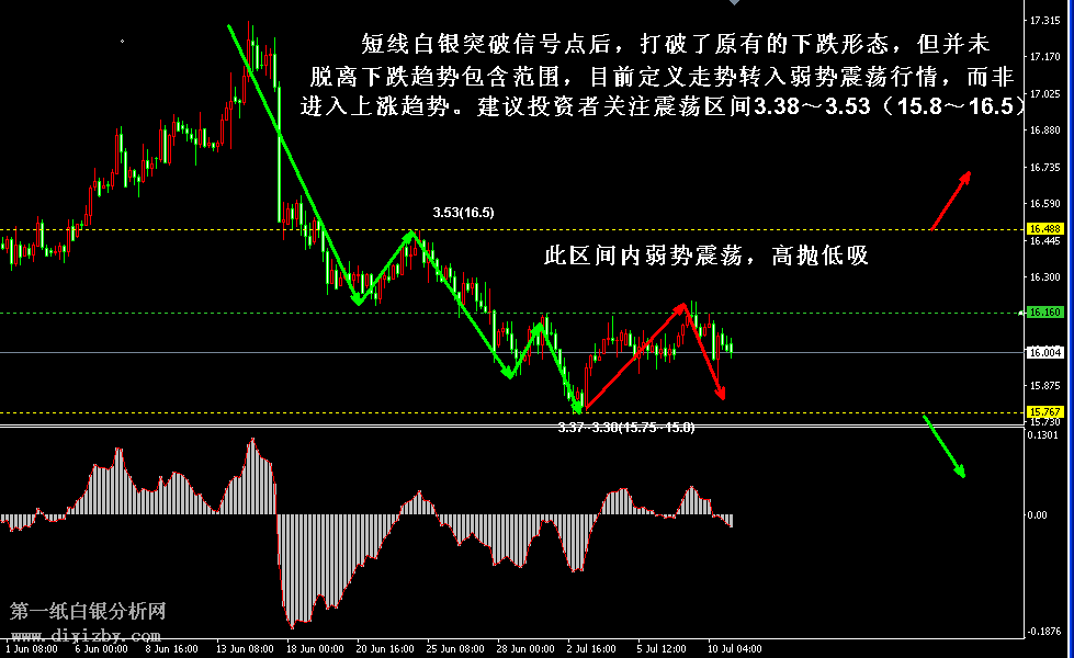 今日下方關鍵支撐3.38(15.8)、3.26(15.25);今日上方關鍵阻3.48~3.5(16.3~16.4)、3.53(16.5)、3.62~3.67(16.95~17.05)、3.71(17.35)。 提示:技術僅僅是基于概率論和統計學的一種綜合分析手段,絕非預測。所以技術分析是在考慮做好止損的情況下去博取大概率事件,投資不可過于迷信技術分析。(短線操作請一定做好止損,一旦被損,代表分析師基于概率和統計的技術分析不適用于當前行情) 另外,由于紙白銀價格是國際銀價換算而來,而換算過程中涉及到人民幣對美元匯率的變化,即使在國際銀價不變化的情況下,如果人民幣貶值或升值,也會導致紙白銀價格出現變動。因此,我們的分析只采用最新的國際銀價對應的人民幣白銀價格,如與過去分析價格有出入, 投資者應知曉其原因。 1、文中價格為紙白銀價格,括號內為國際銀價,投資者可雙向參考。 2、以上所有價格為工商銀行買入價,即紙白銀低價。進倉點位要再加點差(各銀行點差不一),出倉則不要。 3、第一紙白銀給出的所有建議僅供投資者參考,不作為下單絕對依據,切勿過于依賴。 4、北京時間09:00發布此文章。 5、上一交易日白銀價格分析情況:(7月10日)白銀突破信號點止跌 短線走勢轉入弱勢震蕩