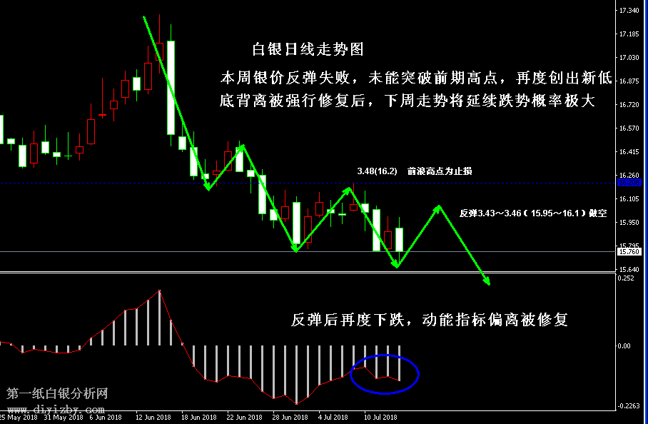 目前白銀價(jià)格是3.393克(15.760美元)。本周銀價(jià)繼續(xù)延續(xù)跌勢(shì),周內(nèi)行情雖嘗試反彈,但最終未能突破日線前浪高點(diǎn),再度下跌后創(chuàng)出新低破位了中線支撐位3.39~3.4(15.75~15.8)。隨著本周走勢(shì)收盤大陰線,且跌破支撐位,下周白銀將繼續(xù)向下探底回落的可能性極大,建議投資者下周可采取輕倉(cāng)高拋?zhàn)隹盏乃悸凡僮。如下圖所示為白銀日線走勢(shì)圖,圖中藍(lán)線所示為本周銀價(jià)反彈高點(diǎn)3.48(16.2),此次反彈未能突破前浪高點(diǎn)3.54(16.5),進(jìn)而再度沖高回落后,白銀又創(chuàng)出新低。參考圖中綠色箭頭所示形態(tài),日線走勢(shì)正維持良好的下跌趨勢(shì),其中浪型的高點(diǎn)和低點(diǎn)均處于不斷下移的狀態(tài),這是典型的下跌趨勢(shì)的特征,暗示下周銀價(jià)仍有望繼續(xù)回落。下周行情若出現(xiàn)反彈,受到趨勢(shì)特征影響,其突破本周高點(diǎn)3.48(16.2)的可能性也較低,投資者可把握住反彈的機(jī)會(huì)嘗試做空。建議下周投資者可圍繞3.48(16.2)為短線止損點(diǎn),嘗試反彈分批做空的思路,可在銀價(jià)反彈至3.43~3.46(15.95~16.1)附近輕倉(cāng)布局空單,嚴(yán)格止損3.48(16.2)上方,目標(biāo)則逐漸看至3.27(15.25)的下一道中線強(qiáng)支撐位。值得注意的是,本周白銀曾意圖圍繞支撐位3.39~3.4(15.75~15.8)形成雙底形態(tài),此處曾出現(xiàn)可能底背離的風(fēng)險(xiǎn),周四銀價(jià)圍繞支撐位也出現(xiàn)了較大反彈,但周五行情再度下跌,回吐了所有漲幅,此前可能出現(xiàn)的底背離形態(tài)也被強(qiáng)行修復(fù)。如圖中藍(lán)色圈所示,銀價(jià)在反彈后再度下跌,動(dòng)能指標(biāo)所產(chǎn)生的偏離風(fēng)險(xiǎn)已經(jīng)被強(qiáng)行修復(fù),此時(shí)的狀態(tài)是“下跌趨勢(shì)延續(xù)+雙底支撐位被破壞+空頭力量正意欲再度放量”,三者共同作用下,推測(cè)走勢(shì)再難以圍繞支撐位3.39~3.4(15.75~15.8)形成止跌企穩(wěn),此處需放棄做多思路。綜合分析,近兩周銀價(jià)雖然觸及3.39~3.4(15.75~15.8)出現(xiàn)反彈行情,但最終反彈幅度未能打破此前的下跌趨勢(shì)形態(tài),而反彈后銀價(jià)再度下跌創(chuàng)出新低,并未形成任何止跌企穩(wěn)的形態(tài)和跡象,此種情況下,下周走勢(shì)繼續(xù)回落的可能性極大,空頭力量正進(jìn)一步放量,建議投資者圍繞本周高點(diǎn)3.48(16.2)嘗試分批布局空單,在銀價(jià)未出現(xiàn)日線級(jí)別的止跌企穩(wěn)信號(hào)之前,謹(jǐn)慎做多。(注: 由于紙白銀價(jià)格是國(guó) 際銀價(jià)換算而來,而換算過程中涉及到人民幣對(duì)美元匯率的變化,即使在國(guó)際銀價(jià)不變化的情 況下,如果人民幣貶值或升值,也會(huì)導(dǎo)致紙白銀價(jià)格出現(xiàn)變動(dòng)。因此,我們的分析只采用最新 的國(guó)際銀價(jià)對(duì)應(yīng)的人民幣白銀價(jià)格,如與過去分析價(jià)格有出入, 投資者應(yīng)知曉其原因。)