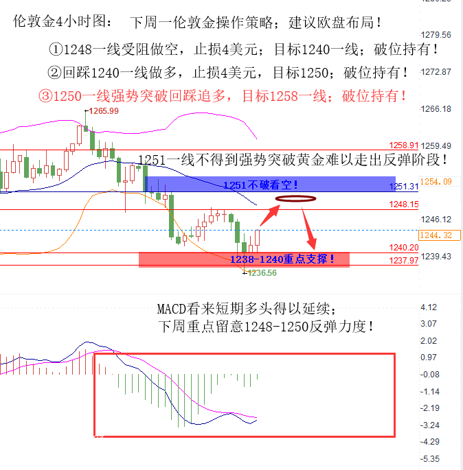 4小時圖中可以看出周五黃金剛好觸及1338一線支撐有效快速起穩(wěn),雖然說一波下砸跌破1338最低至1336一線不過1338附近支撐奏效快速反彈最高1244一線震蕩收市;觸及支撐反彈不代表黃金確認底部形成反彈階段,我們亞盤歐盤選擇觀望,黃金反彈形成必須要突破1248-1250一線重點阻力,因此現(xiàn)在1244處于中間地帶操作上當然是比較迷茫,這也就是很多人選擇亞盤還未確認方向而盲目操作導致屢屢被套原因;基本上歐盤或者美盤行情走勢都出來后方向就很明確了;下周亞盤歐盤欲回踩1240一線可選擇低多,若是亞盤歐盤1248-1250一線受阻不前則可選擇高空,強勢突破1250回踩追多;方向都很可觀所以再次建議亞盤不急于布局,等待歐盤美盤到來,重點關注圖中提示重要點位!