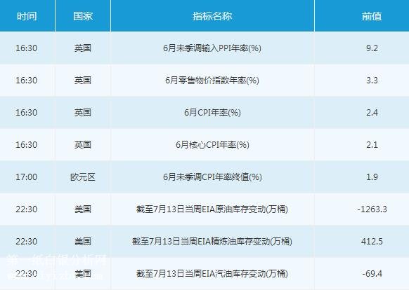 周三(7月18日)亞歐時段,投資者需關注16:30公布的英國6月CPI年率、6月核心CPI年率,17:00公布的歐元區6月未季調CPI年率終值,22:30公布的美國EIA原油庫存數據以及22:00美聯儲主席鮑威爾出席眾議院金融服務委員會,就經濟及貨幣政策發表半年一度的證詞陳述。