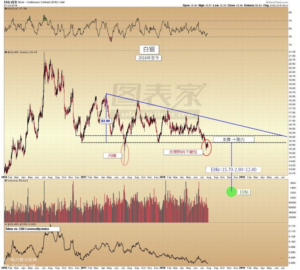 Bullion Exchanges市場分析師Christopher Aaron稱,根據(jù)三角形形態(tài)的破位目標(biāo)計(jì)算,白銀價(jià)格下行最大目標(biāo)看至12.80。白銀合約持有者可能會(huì)考慮在接下來幾個(gè)月斬倉以減少損失。15.70下方應(yīng)當(dāng)會(huì)存在與該價(jià)位上方買家數(shù)量相當(dāng)?shù)馁u家,這將使得12.80成為一個(gè)短期目標(biāo)。不排除價(jià)格在2018年年底前觸及該水平的可能性。 但是,考慮到下降三角形形成的過程緩慢,破位后的下行也可能是徐緩的,因此,Aaron預(yù)期價(jià)格達(dá)成12.80目標(biāo)位的目標(biāo)日期在2018年8月末至2019年。 若價(jià)格重新回升至16.10的前支撐區(qū)域上界之上,或?qū)⒈砻鞯浦问羌倨莆弧2贿^,2017年4月以來的下降趨勢線(藍(lán)線)仍將構(gòu)成強(qiáng)勁阻力。