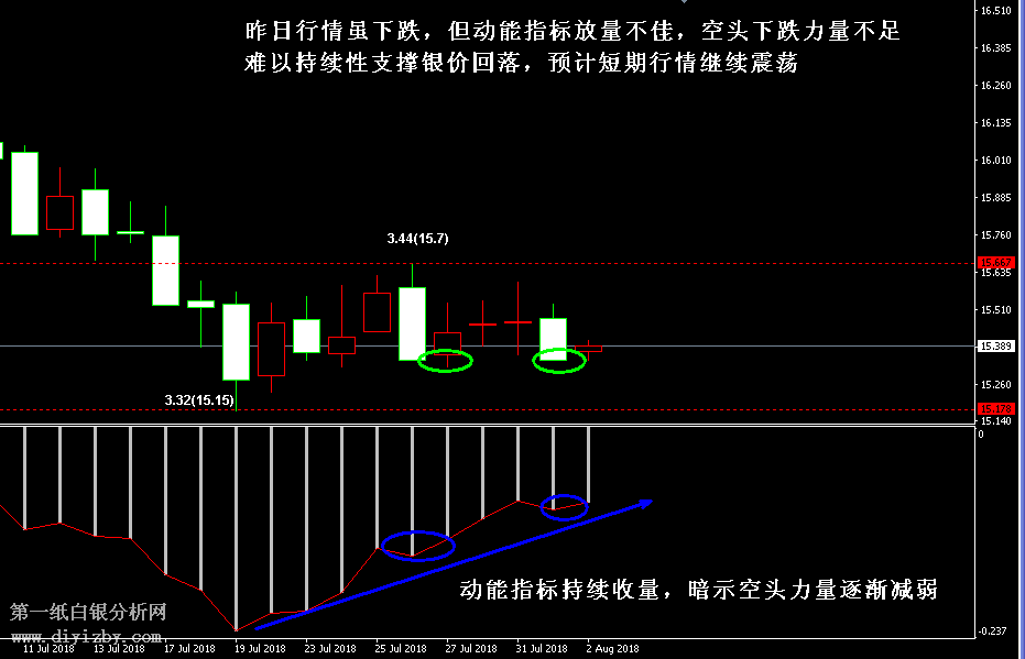 今日下方關鍵支撐3.32~3.33(15.15~15.2);今日上方關鍵阻3.44(15.7)、3.49~3.5(15.95~16)、3.55(16.2)。 提示:技術僅僅是基于概率論和統計學的一種綜合分析手段,絕非預測。所以技術分析是在考慮做好止損的情況下去博取大概率事件,投資不可過于迷信技術分析。(短線操作請一定做好止損,一旦被損,代表分析師基于概率和統計的技術分析不適用于當前行情) 另外,由于紙白銀價格是國際銀價換算而來,而換算過程中涉及到人民幣對美元匯率的變化,即使在國際銀價不變化的情況下,如果人民幣貶值或升值,也會導致紙白銀價格出現變動。因此,我們的分析只采用最新的國際銀價對應的人民幣白銀價格,如與過去分析價格有出入, 投資者應知曉其原因。 1、文中價格為紙白銀價格,括號內為國際銀價,投資者可雙向參考。 2、以上所有價格為工商銀行買入價,即紙白銀低價。進倉點位要再加點差(各銀行點差不一),出倉則不要。 3、第一紙白銀給出的所有建議僅供投資者參考,不作為下單絕對依據,切勿過于依賴。 4、北京時間09:00發布此文章。 5、上一交易日白銀價格分析情況:(8月1日)白銀高點低點緩慢抬升 延續反彈沖擊信號點
