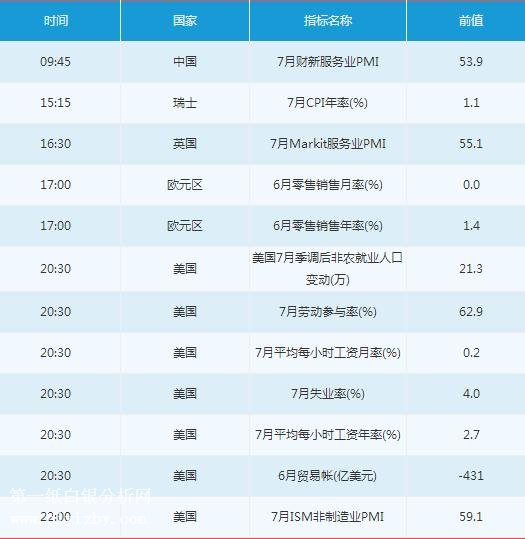 周五(8月3日)投資者需重點關注9:45中國7月財新服務業PMI、15:15瑞士7月CPI、16:30英國7月Markit服務業PMI、17:00歐元區6月零售銷售月率,還需關注20:30美國7月非農數據、美國6月貿易帳與22:00美國7月ISM非制造業PMI等數據。