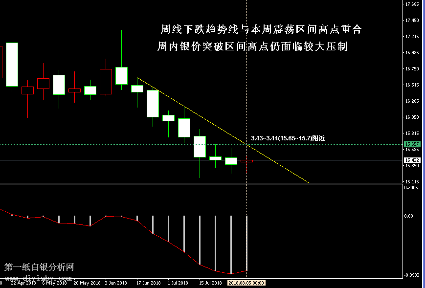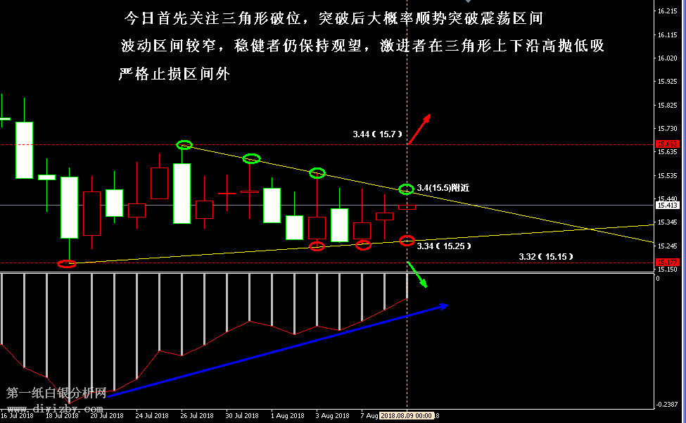 今日下方關(guān)鍵支撐3.32(15.15);今日上方關(guān)鍵阻3.44(15.7)、3.5~3.51(15.95~16)、3.55(16.2)。 提示:技術(shù)僅僅是基于概率論和統(tǒng)計(jì)學(xué)的一種綜合分析手段,絕非預(yù)測(cè)。所以技術(shù)分析是在考慮做好止損的情況下去博取大概率事件,投資不可過(guò)于迷信技術(shù)分析。(短線操作請(qǐng)一定做好止損,一旦被損,代表分析師基于概率和統(tǒng)計(jì)的技術(shù)分析不適用于當(dāng)前行情) 另外,由于紙白銀價(jià)格是國(guó)際銀價(jià)換算而來(lái),而換算過(guò)程中涉及到人民幣對(duì)美元匯率的變化,即使在國(guó)際銀價(jià)不變化的情況下,如果人民幣貶值或升值,也會(huì)導(dǎo)致紙白銀價(jià)格出現(xiàn)變動(dòng)。因此,我們的分析只采用最新的國(guó)際銀價(jià)對(duì)應(yīng)的人民幣白銀價(jià)格,如與過(guò)去分析價(jià)格有出入, 投資者應(yīng)知曉其原因。 1、文中價(jià)格為紙白銀價(jià)格,括號(hào)內(nèi)為國(guó)際銀價(jià),投資者可雙向參考。 2、以上所有價(jià)格為工商銀行買(mǎi)入價(jià),即紙白銀低價(jià)。進(jìn)倉(cāng)點(diǎn)位要再加點(diǎn)差(各銀行點(diǎn)差不一),出倉(cāng)則不要。 3、第一紙白銀給出的所有建議僅供投資者參考,不作為下單絕對(duì)依據(jù),切勿過(guò)于依賴。 4、北京時(shí)間09:00發(fā)布此文章。 5、上一交易日白銀價(jià)格分析情況:(8月8日)白銀形成收縮三角形 雙震蕩區(qū)間波幅縮窄