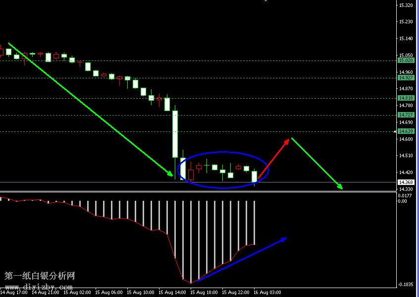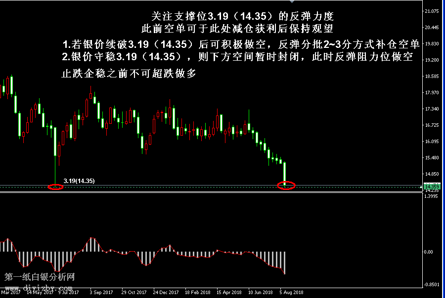 今日下方關鍵支撐3.19(14.35)、3(13.5);今日上方關鍵阻3.26~3.28(14.65~14.75)、3.32~3.33(14.9~14.95)、3.37(15.15)、3.42(15.35)。 提示:技術僅僅是基于概率論和統計學的一種綜合分析手段,絕非預測。所以技術分析是在考慮做好止損的情況下去博取大概率事件,投資不可過于迷信技術分析。(短線操作請一定做好止損,一旦被損,代表分析師基于概率和統計的技術分析不適用于當前行情) 另外,由于紙白銀價格是國際銀價換算而來,而換算過程中涉及到人民幣對美元匯率的變化,即使在國際銀價不變化的情況下,如果人民幣貶值或升值,也會導致紙白銀價格出現變動。因此,我們的分析只采用最新的國際銀價對應的人民幣白銀價格,如與過去分析價格有出入, 投資者應知曉其原因。 1、文中價格為紙白銀價格,括號內為國際銀價,投資者可雙向參考。 2、以上所有價格為工商銀行買入價,即紙白銀低價。進倉點位要再加點差(各銀行點差不一),出倉則不要。 3、第一紙白銀給出的所有建議僅供投資者參考,不作為下單絕對依據,切勿過于依賴。 4、北京時間09:00發布此文章。 5、上一交易日白銀價格分析情況:(8月15日)白銀打開回調空間 空頭占優下跌趨勢將延續