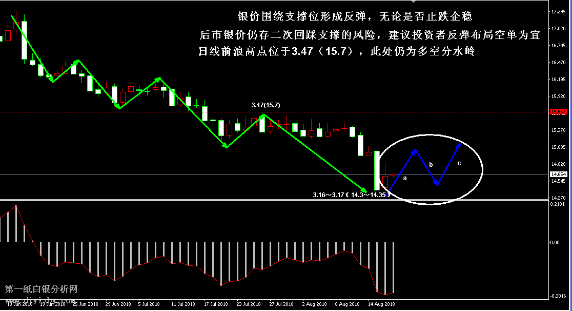 今日下方關(guān)鍵支撐3.16~3.17(14.3~14.35)、2.98(13.5);今日上方關(guān)鍵阻3.29~3.31(14.9~15)、3.35(15.15)、3.39(15.35)。 提示:技術(shù)僅僅是基于概率論和統(tǒng)計學的一種綜合分析手段,絕非預測。所以技術(shù)分析是在考慮做好止損的情況下去博取大概率事件,投資不可過于迷信技術(shù)分析。(短線操作請一定做好止損,一旦被損,代表分析師基于概率和統(tǒng)計的技術(shù)分析不適用于當前行情) 另外,由于紙白銀價格是國際銀價換算而來,而換算過程中涉及到人民幣對美元匯率的變化,即使在國際銀價不變化的情況下,如果人民幣貶值或升值,也會導致紙白銀價格出現(xiàn)變動。因此,我們的分析只采用最新的國際銀價對應的人民幣白銀價格,如與過去分析價格有出入, 投資者應知曉其原因。 1、文中價格為紙白銀價格,括號內(nèi)為國際銀價,投資者可雙向參考。 2、以上所有價格為工商銀行買入價,即紙白銀低價。進倉點位要再加點差(各銀行點差不一),出倉則不要。 3、第一紙白銀給出的所有建議僅供投資者參考,不作為下單絕對依據(jù),切勿過于依賴。 4、北京時間09:00發(fā)布此文章。 5、上一交易日白銀價格分析情況:(8月16日)白銀急速下跌觸及支撐 暫未止跌或繼續(xù)回落