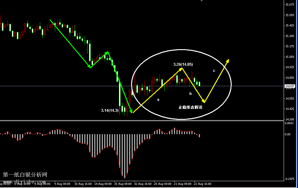 今日下方關鍵支撐3.17(14.45)、3.14(14.3)、2.98(13.6);今日上方關鍵阻3.24~3.26(14.75~14.85)、3.3(15)、3.32~3.33(15.1~15.15)、3.37(15.35)、3.41~3.42(15.5~15.55)、3.45(15.7)。 提示:技術僅僅是基于概率論和統計學的一種綜合分析手段,絕非預測。所以技術分析是在考慮做好止損的情況下去博取大概率事件,投資不可過于迷信技術分析。(短線操作請一定做好止損,一旦被損,代表分析師基于概率和統計的技術分析不適用于當前行情) 另外,由于紙白銀價格是國際銀價換算而來,而換算過程中涉及到人民幣對美元匯率的變化,即使在國際銀價不變化的情況下,如果人民幣貶值或升值,也會導致紙白銀價格出現變動。因此,我們的分析只采用最新的國際銀價對應的人民幣白銀價格,如與過去分析價格有出入, 投資者應知曉其原因。 1、文中價格為紙白銀價格,括號內為國際銀價,投資者可雙向參考。 2、以上所有價格為工商銀行買入價,即紙白銀低價。進倉點位要再加點差(各銀行點差不一),出倉則不要。 3、第一紙白銀給出的所有建議僅供投資者參考,不作為下單絕對依據,切勿過于依賴。 4、北京時間09:00發布此文章。 5、上一交易日白銀價格分析情況:(8月22日)白銀繼續考驗阻力帶 謹防走勢二次回踩風險