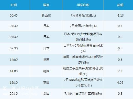 周五(8月24日)投資者需重點關(guān)注6:45新西蘭7月貿(mào)易帳、7:30日本7月全國CPI年率、14:00 德國二季度季調(diào)后GDP季環(huán)比終值、16:30英國7月BBA房屋購買抵押貸款許可件數(shù)、20:30美國7月耐用品訂單月率初值、22:00鮑威爾在杰克遜霍爾全球央行年會上就經(jīng)濟與貨幣政策講話內(nèi)容。