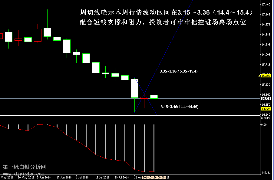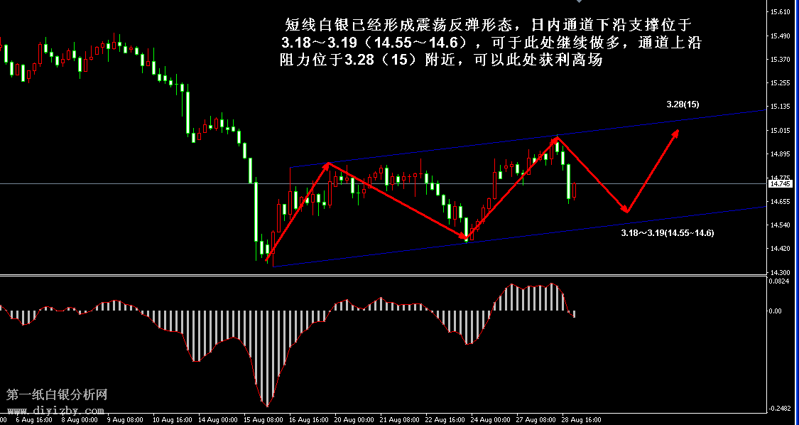 今日下方關(guān)鍵支撐3.18~3.19(14.55~14.6)、3.15~3.16(14.4~14.45)、3.13(14.3);今日上方關(guān)鍵阻3.28(15)、3.35~3.36(15.35~15.4)、3.39(15.55)、3.43(15.7)。 提示:技術(shù)僅僅是基于概率論和統(tǒng)計學(xué)的一種綜合分析手段,絕非預(yù)測。所以技術(shù)分析是在考慮做好止損的情況下去博取大概率事件,投資不可過于迷信技術(shù)分析。(短線操作請一定做好止損,一旦被損,代表分析師基于概率和統(tǒng)計的技術(shù)分析不適用于當(dāng)前行情) 另外,由于紙白銀價格是國際銀價換算而來,而換算過程中涉及到人民幣對美元匯率的變化,即使在國際銀價不變化的情況下,如果人民幣貶值或升值,也會導(dǎo)致紙白銀價格出現(xiàn)變動。因此,我們的分析只采用最新的國際銀價對應(yīng)的人民幣白銀價格,如與過去分析價格有出入, 投資者應(yīng)知曉其原因。 1、文中價格為紙白銀價格,括號內(nèi)為國際銀價,投資者可雙向參考。 2、以上所有價格為工商銀行買入價,即紙白銀低價。進(jìn)倉點位要再加點差(各銀行點差不一),出倉則不要。 3、第一紙白銀給出的所有建議僅供投資者參考,不作為下單絕對依據(jù),切勿過于依賴。 4、北京時間09:00發(fā)布此文章。 5、上一交易日白銀價格分析情況:(8月28日)白銀完成止跌企穩(wěn)形態(tài) 走勢將轉(zhuǎn)入震蕩格局