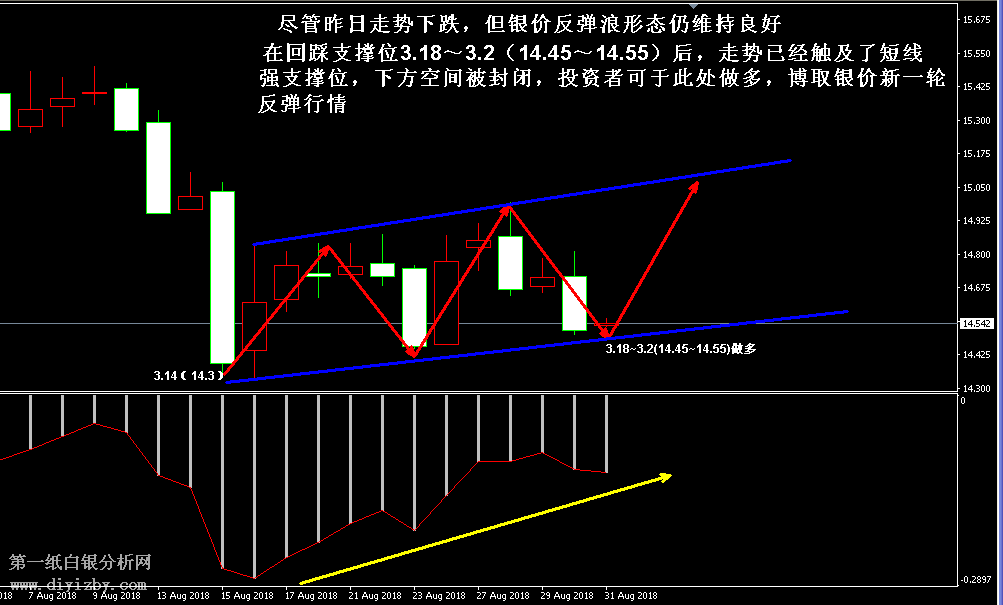 今日下方關鍵支撐3.18~3.19(14.45~14.5)、3.14(14.3);今日上方關鍵阻3.3(15)、3.37(15.35)、3.41(15.55)、3.44(15.7)。 提示:技術僅僅是基于概率論和統計學的一種綜合分析手段,絕非預測。所以技術分析是在考慮做好止損的情況下去博取大概率事件,投資不可過于迷信技術分析。(短線操作請一定做好止損,一旦被損,代表分析師基于概率和統計的技術分析不適用于當前行情) 另外,由于紙白銀價格是國際銀價換算而來,而換算過程中涉及到人民幣對美元匯率的變化,即使在國際銀價不變化的情況下,如果人民幣貶值或升值,也會導致紙白銀價格出現變動。因此,我們的分析只采用最新的國際銀價對應的人民幣白銀價格,如與過去分析價格有出入, 投資者應知曉其原因。 1、文中價格為紙白銀價格,括號內為國際銀價,投資者可雙向參考。 2、以上所有價格為工商銀行買入價,即紙白銀低價。進倉點位要再加點差(各銀行點差不一),出倉則不要。 3、第一紙白銀給出的所有建議僅供投資者參考,不作為下單絕對依據,切勿過于依賴。 4、北京時間09:00發布此文章。 5、上一交易日白銀價格分析情況:(8月30日)白銀運行于上升通道 回踩支撐積極布局多單