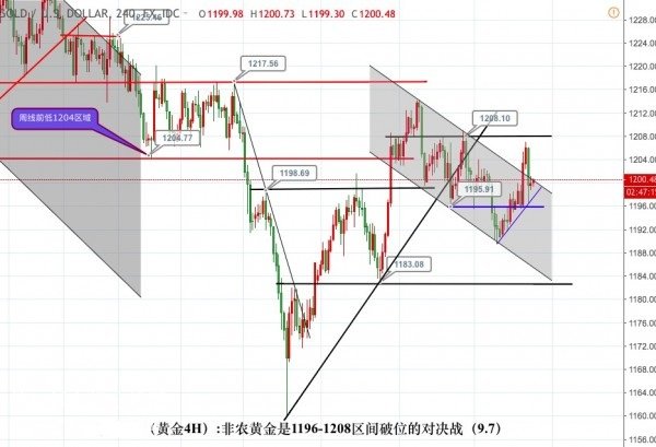 昨日市場如期下探周三盤中強弱分界線的1196后歐美盤走高,盤中1196多到位1202下降通道的阻力點,美盤前1203再多單美盤依然持續(xù)承壓在前期盤中阻力1208下方,所以1205.5果斷離場,完美躲過了盤尾再次回撤到1196的風險,原本看似強勢的日線最終還是未能給市場指出明確的方向,多空爭奪戰(zhàn)只能在今日非農一決勝負,而1196的多頭防守和1208的關鍵阻力形成的區(qū)間將是市場多空爭奪戰(zhàn)的勝負裁判,企穩(wěn)1208多天仍具備重新起航的動能和空間,但若再破1196,短線多頭則無力回天!