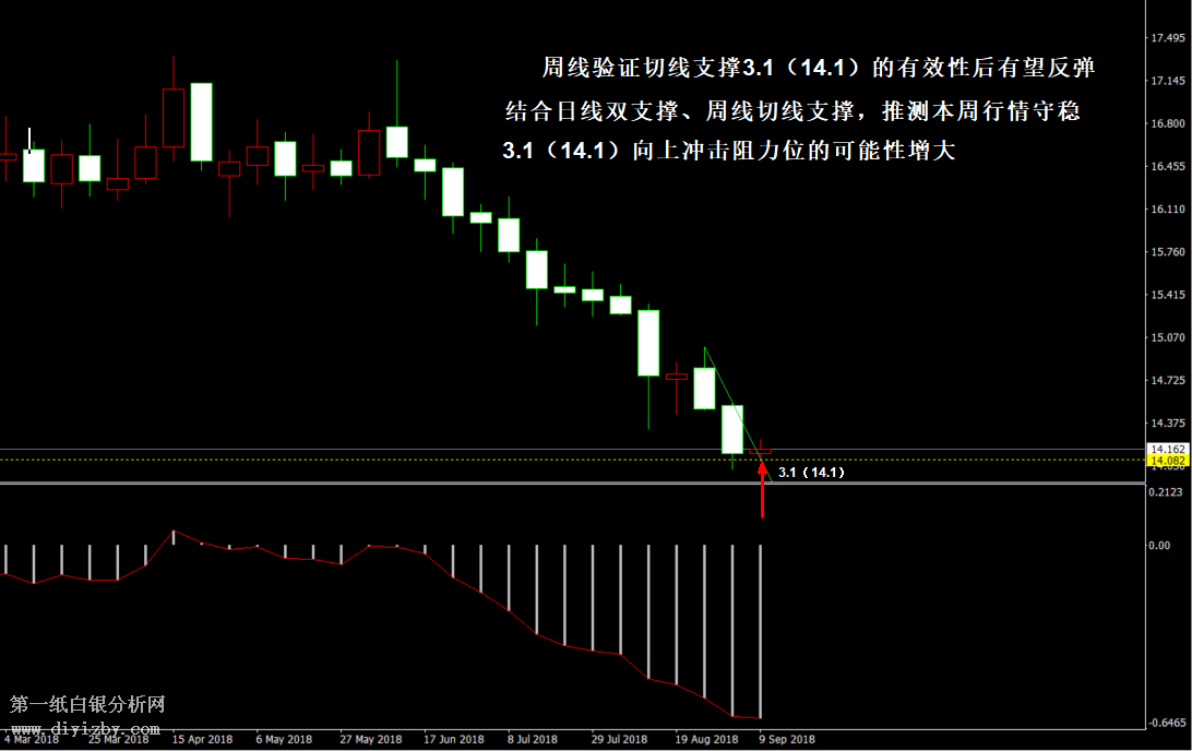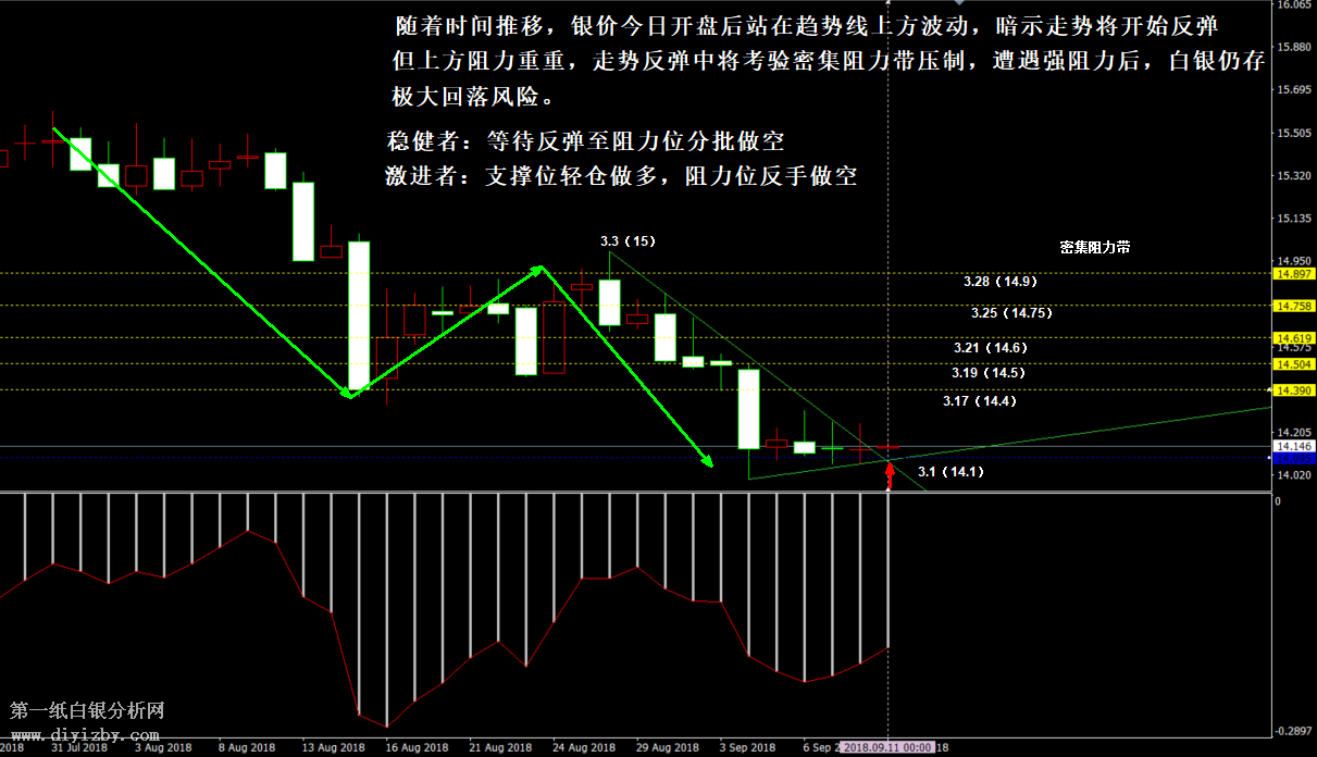 今日下方關鍵支撐3.07(14)、2.99(13.6);今日上方關鍵阻力3.17(14.4)、3.19(14.5)、3.21(14.6)、3.25(14.75)、3.28(14.9)、3.3(15)。 提示:技術僅僅是基于概率論和統計學的一種綜合分析手段,絕非預測。所以技術分析是在考慮做好止損的情況下去博取大概率事件,投資不可過于迷信技術分析。(短線操作請一定做好止損,一旦被損,代表分析師基于概率和統計的技術分析不適用于當前行情) 另外,由于紙白銀價格是國際銀價換算而來,而換算過程中涉及到人民幣對美元匯率的變化,即使在國際銀價不變化的情況下,如果人民幣貶值或升值,也會導致紙白銀價格出現變動。因此,我們的分析只采用最新的國際銀價對應的人民幣白銀價格,如與過去分析價格有出入, 投資者應知曉其原因。 1、文中價格為紙白銀價格,括號內為國際銀價,投資者可雙向參考。 2、以上所有價格為工商銀行買入價,即紙白銀低價。進倉點位要再加點差(各銀行點差不一),出倉則不要。 3、第一紙白銀給出的所有建議僅供投資者參考,不作為下單絕對依據,切勿過于依賴。 4、北京時間09:00發布此文章。 5、上一交易日白銀價格分析情況:(9月10日)白銀再考驗趨勢線壓力 突破與否決定是否反彈