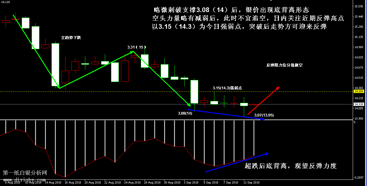 今日下方關鍵支撐3.07~3.08(13.95~14)、2.99(13.6);今日上方關鍵阻力3.18(14.45)、3.22(14.6)、3.25(14.75)、3.28(14.9)、3.31(15)。 提示:技術僅僅是基于概率論和統計學的一種綜合分析手段,絕非預測。所以技術分析是在考慮做好止損的情況下去博取大概率事件,投資不可過于迷信技術分析。(短線操作請一定做好止損,一旦被損,代表分析師基于概率和統計的技術分析不適用于當前行情) 另外,由于紙白銀價格是國際銀價換算而來,而換算過程中涉及到人民幣對美元匯率的變化,即使在國際銀價不變化的情況下,如果人民幣貶值或升值,也會導致紙白銀價格出現變動。因此,我們的分析只采用最新的國際銀價對應的人民幣白銀價格,如與過去分析價格有出入, 投資者應知曉其原因。 1、文中價格為紙白銀價格,括號內為國際銀價,投資者可雙向參考。 2、以上所有價格為工商銀行買入價,即紙白銀低價。進倉點位要再加點差(各銀行點差不一),出倉則不要。 3、第一紙白銀給出的所有建議僅供投資者參考,不作為下單絕對依據,切勿過于依賴。 4、北京時間09:00發布此文章。 5、上一交易日白銀價格分析情況:(9月11日)白銀阻力線轉為支撐 即將向上考驗密集壓力帶