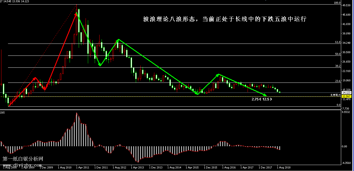 白銀短線策略:(波段:觀望;短線:關注突破擇機操作)。 自2008年至今的十年行情中,銀價長期走勢正處于波浪理論中的八浪形態運行,過去的三浪上漲構造了銀價從2008年至2011年的三年牛市,而當前的五浪下跌又形成了銀價從2011年至2018年的7年熊市。如下圖所示為白銀月線走勢圖,長期趨勢仍然處于紅色箭頭所示的上漲形態范圍內波動,但當前行情正運行于下跌五浪形態中,從2016年至今的一輪下跌可定義為第五浪下跌行情。根據波浪理論分析,當八浪走勢運行完畢后(下跌五浪結束后),新的一個周期將重新開啟(新八浪行情)。當前的下跌浪也是長期熊市的最后一輪下跌走勢,更是黎明前最黑暗,市場人氣最薄弱的時候。根據月線支撐形態來分析,此輪下跌的強力支撐位在2.75(12.5)附近,一旦銀價朝著2.99(13.6)附近沖擊,此處恐難以守穩,最終跌破后或創出歷史新低,在靠近2.75(12.5)附近或最終完成下跌五浪的終結形態。