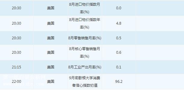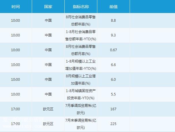 周五(9月14日)投資者需重點(diǎn)關(guān)注10:00中國(guó)8月社會(huì)消費(fèi)品零售總額、1-8月規(guī)模以上工業(yè)增加值年率、8月規(guī)模以上工業(yè)增加值、1-8月城鎮(zhèn)固定資產(chǎn)投資年率、17:00歐元區(qū)7月貿(mào)易帳、18:00英國(guó)央行行長(zhǎng)卡尼講話(huà)、20:30美國(guó)8月進(jìn)口物價(jià)指數(shù)、(核心)零售銷(xiāo)售月率、21:15美國(guó)8月工業(yè)產(chǎn)出月率、22:00美國(guó)9月密歇根大學(xué)消費(fèi)者信心指數(shù)初值。