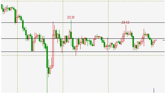 就技術面而言,白銀的市場走勢變化不大,和前幾天一樣箱體震蕩的走勢依舊沒有改變,不同的是這一次是從高位向下回落,就技術而言最近的操作思路相對較為單一,在箱體沒有被有效破壞和改變之前,繼續延續震蕩的思路來進行操作較為合理,但是隨著時間的推移,需要注意的一點是當價格接近箱體的上下邊沿的時候,需要特別注意相應的風險控制,以防市場方向的變化。 白銀方面,天圖上的K線組合形成橫向排列,走勢維持震蕩不變,本日波動區間依然看22.90-22.20美元。