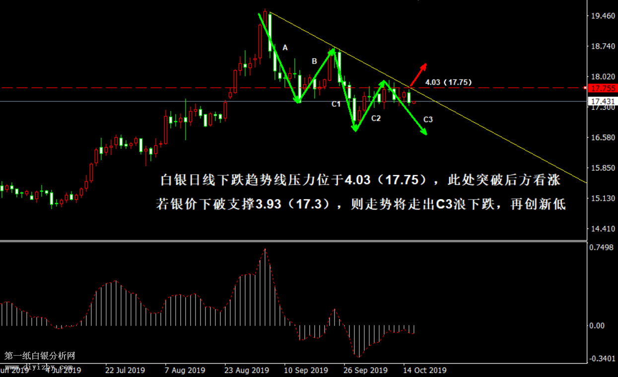 今日下方關鍵支撐3.93(17.3)、3.77~3.78(16.6~16.65)、3.73~3.74(16.45~16.5)。;今日上方關鍵阻力4.03(17.75)、4.09(18)、4.13(18.2)、4.25(18.7)。 提示:技術僅僅是基于概率論和統計學的一種綜合分析手段,絕非預測。所以技術分析是在考慮做好止損的情況下去博取大概率事件,投資不可過于迷信技術分析。(短線操作請一定做好止損,一旦被損,代表分析師基于概率和統計的技術分析不適用于當前行情) 另外,由于紙白銀價格是國際銀價換算而來,而換算過程中涉及到人民幣對美元匯率的變化,即使在國際銀價不變化的情況下,如果人民幣貶值或升值,也會導致紙白銀價格出現變動。因此,我們的分析只采用最新的國際銀價對應的人民幣白銀價格,如與過去分析價格有出入, 投資者應知曉其原因。 1、文中價格為紙白銀價格,括號內為國際銀價,投資者可雙向參考。 2、以上價格為工商銀行買入價,即紙白銀低價。進倉點位要再加點差(各銀行點差不一),出倉則不要。 3、第一紙白銀給出的所有建議僅供投資者參考,不作為下單依據,作者不持有白銀,也不計劃買入。觀點僅供參考,不構成投資建議,風險自擔。 4、北京時間09:00發布此文章。 5、上一交易日白銀價格分析情況:(10月15日)白銀大趨勢看跌仍不變 但短線走勢或迎來反彈