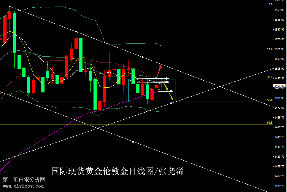 技術(shù)上;日線級(jí)別;金價(jià)在1557美元而下的下行趨勢(shì)線產(chǎn)生的第三次回落中暫時(shí)止跌,并處于一定的區(qū)間交投之中。整體上,仍有所承壓,日內(nèi)也面臨區(qū)間上邊阻力的回撤壓力,同時(shí)此處也是38.2%回撤線及布林帶中軌和30日均線的阻力所在,故此隔夜金價(jià)再次受挫下行也屬正常,并且在承壓回撤的趨勢(shì)中,短期難以突破也是比較正規(guī)的看法。指標(biāo)上,雖KDJ走勢(shì)趨向上行集中,但也不是明顯的看漲信號(hào),加上MACD綠色動(dòng)能柱維持,RSI指標(biāo)平穩(wěn),暗示上行動(dòng)能仍缺乏延續(xù)力量。上方仍需關(guān)注1495-1497美元阻力。下方則關(guān)注5日均線的及時(shí)阻力1489美元,以及70日均線1487美元。