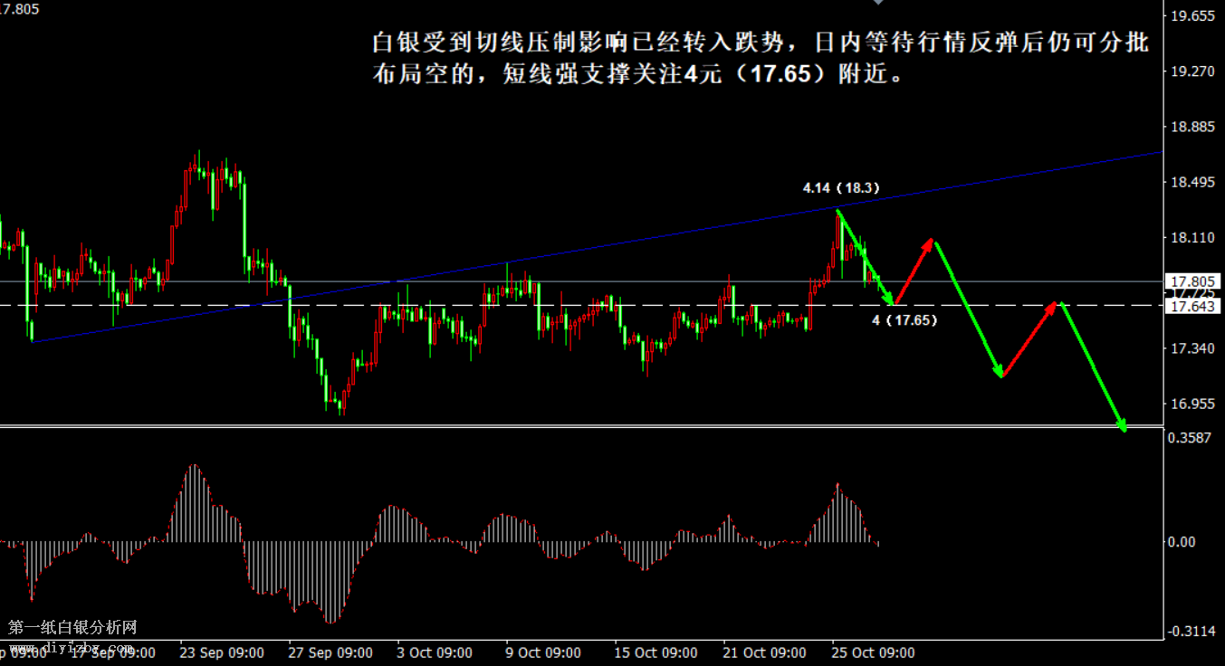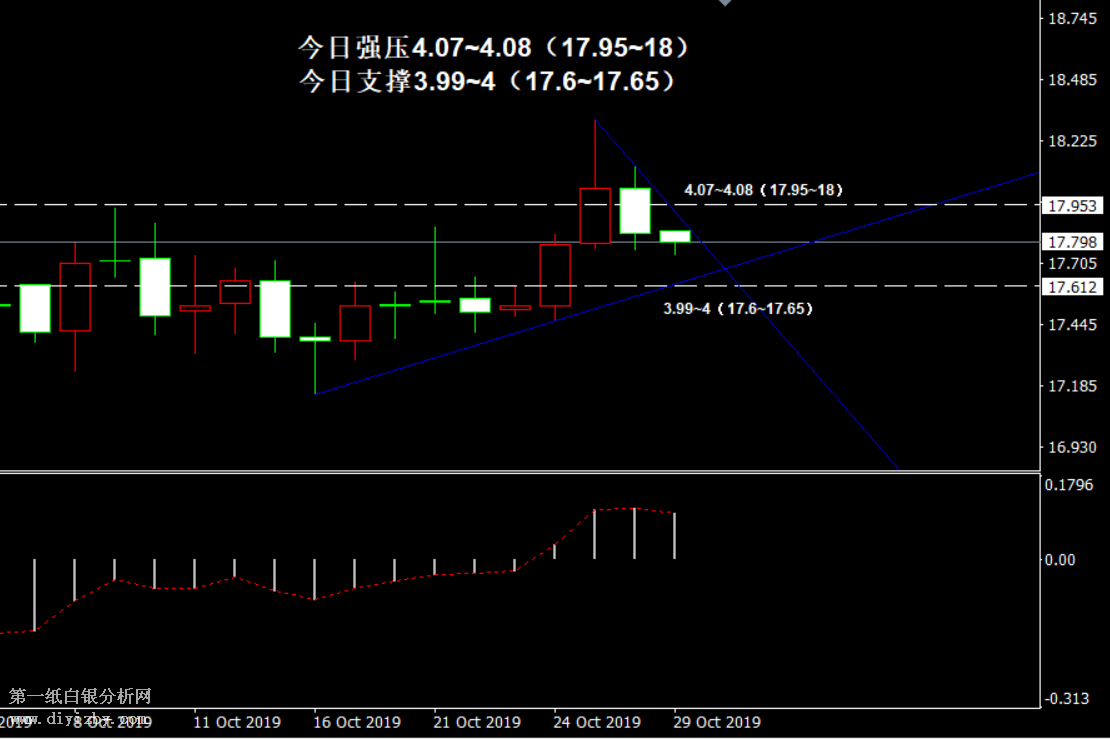 今日下方關(guān)鍵支撐4(17.6.5)、3.89(17.2)、3.81(16.85)、3.75~3.77(16.6~16.65)、3.71~3.72(16.45~16.5);今日上方關(guān)鍵阻力4.08(18)、4.1(18.1)、4.12(18.2)、4.14(18.3)。 提示:技術(shù)僅僅是基于概率論和統(tǒng)計(jì)學(xué)的一種綜合分析手段,絕非預(yù)測。所以技術(shù)分析是在考慮做好止損的情況下去博取大概率事件,投資不可過于迷信技術(shù)分析。(短線操作請一定做好止損,一旦被損,代表分析師基于概率和統(tǒng)計(jì)的技術(shù)分析不適用于當(dāng)前行情) 另外,由于紙白銀價(jià)格是國際銀價(jià)換算而來,而換算過程中涉及到人民幣對美元匯率的變化,即使在國際銀價(jià)不變化的情況下,如果人民幣貶值或升值,也會導(dǎo)致紙白銀價(jià)格出現(xiàn)變動(dòng)。因此,我們的分析只采用最新的國際銀價(jià)對應(yīng)的人民幣白銀價(jià)格,如與過去分析價(jià)格有出入, 投資者應(yīng)知曉其原因。 1、文中價(jià)格為紙白銀價(jià)格,括號內(nèi)為國際銀價(jià),投資者可雙向參考。 2、以上價(jià)格為工商銀行買入價(jià),即紙白銀低價(jià)。進(jìn)倉點(diǎn)位要再加點(diǎn)差(各銀行點(diǎn)差不一),出倉則不要。 3、第一紙白銀給出的所有建議僅供投資者參考,不作為下單依據(jù),作者不持有白銀,也不計(jì)劃買入。觀點(diǎn)僅供參考,不構(gòu)成投資建議,風(fēng)險(xiǎn)自擔(dān)。 4、北京時(shí)間09:00發(fā)布此文章。 5、上一交易日白銀價(jià)格分析情況:(10月28日)白銀上漲僅定義為反彈 遇阻后需謹(jǐn)防趨勢下跌
