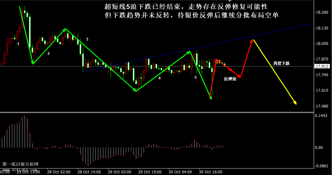 今日下方關鍵支撐4(17.65)、3.9(17.2)、3.81(16.85)、3.75~3.77(16.6~16.65)、3.71~3.72(16.45~16.5);今日上方關鍵阻力4.08(18)、4.12(18.15)、4.14(18.3)。 提示:技術僅僅是基于概率論和統計學的一種綜合分析手段,絕非預測。所以技術分析是在考慮做好止損的情況下去博取大概率事件,投資不可過于迷信技術分析。(短線操作請一定做好止損,一旦被損,代表分析師基于概率和統計的技術分析不適用于當前行情) 另外,由于紙白銀價格是國際銀價換算而來,而換算過程中涉及到人民幣對美元匯率的變化,即使在國際銀價不變化的情況下,如果人民幣貶值或升值,也會導致紙白銀價格出現變動。因此,我們的分析只采用最新的國際銀價對應的人民幣白銀價格,如與過去分析價格有出入, 投資者應知曉其原因。 1、文中價格為紙白銀價格,括號內為國際銀價,投資者可雙向參考。 2、以上價格為工商銀行買入價,即紙白銀低價。進倉點位要再加點差(各銀行點差不一),出倉則不要。 3、第一紙白銀給出的所有建議僅供投資者參考,不作為下單依據,作者不持有白銀,也不計劃買入。觀點僅供參考,不構成投資建議,風險自擔。 4、北京時間09:00發布此文章。 5、上一交易日白銀價格分析情況:(10月30日)白銀強支撐有反彈需求 反彈遇阻仍可繼續做空