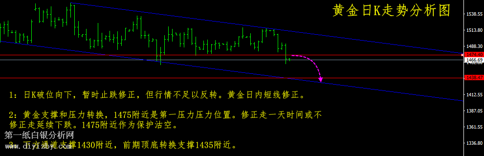 1:黃金的支撐和壓力轉換,1475從支撐位置變成壓力位置,因此1475上下沽空看跌向下。