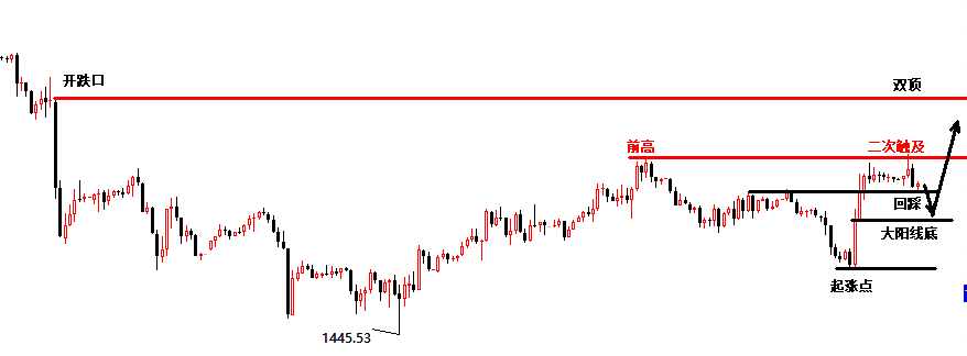 但是在整個收盤過程當中,日線雖然呈現(xiàn)探底回升,但陽線并沒有過多的實體,是類似于錘子形態(tài)去收盤的。同時,價格在早間延續(xù)測試前期高點1475一線,形成雙頂壓制,并不是有效突破。