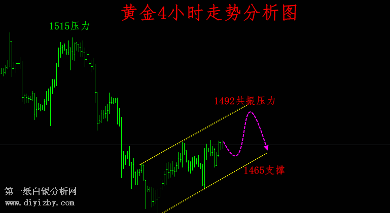 如上圖所示:4H的反彈通道還在持續(xù),跌破旗形整理的通道,黃金會繼續(xù)向下運行。不破這個通道,那么黃金就是慢牛的震蕩修正走勢。下方的支撐位置1465-1467的通道支撐,上方的通道壓力位置1488-1492這里。