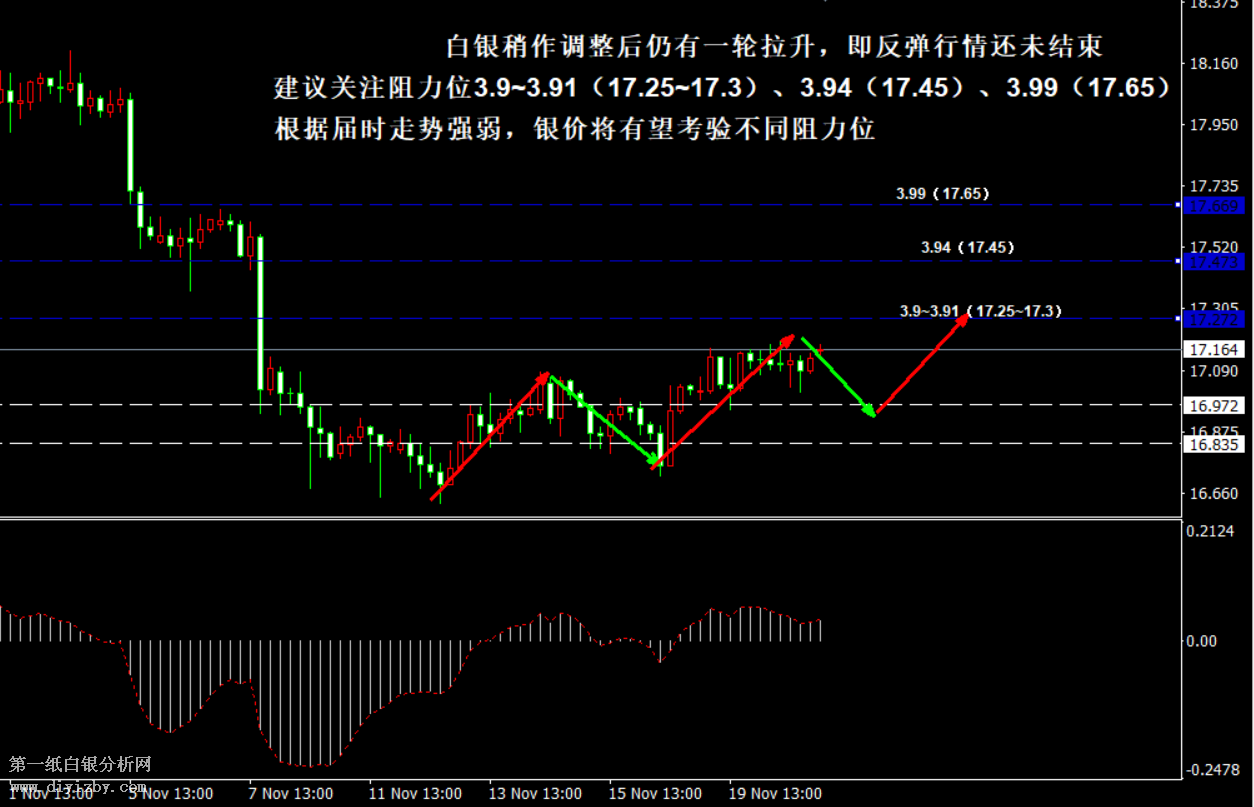 今日下方關鍵支撐3.83(16.95)、3.8(16.85)、3.73(16.5)。今日上方關鍵阻力3.89~3.9(17.2~17.3)。 提示:技術僅僅是基于概率論和統計學的一種綜合分析手段,絕非預測。所以技術分析是在考慮做好止損的情況下去博取大概率事件,投資不可過于迷信技術分析。(短線操作請一定做好止損,一旦被損,代表分析師基于概率和統計的技術分析不適用于當前行情) 另外,由于紙白銀價格是國際銀價換算而來,而換算過程中涉及到人民幣對美元匯率的變化,即使在國際銀價不變化的情況下,如果人民幣貶值或升值,也會導致紙白銀價格出現變動。因此,我們的分析只采用最新的國際銀價對應的人民幣白銀價格,如與過去分析價格有出入, 投資者應知曉其原因。 1、文中價格為紙白銀價格,括號內為國際銀價,投資者可雙向參考。 2、以上價格為工商銀行買入價,即紙白銀低價。進倉點位要再加點差(各銀行點差不一),出倉則不要。 3、第一紙白銀給出的所有建議僅供投資者參考,不作為下單依據,作者不持有白銀,也不計劃買入。觀點僅供參考,不構成投資建議,風險自擔。 4、北京時間09:00發布此文章。 5、上一交易日白銀價格分析情況:(11月20日)白銀反彈行情暫未結束 但運行過程或仍然緩慢