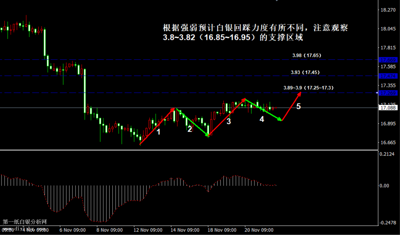 今日下方關(guān)鍵支撐3.82(16.95)、3.8(16.85)、3.72(16.5)。今日上方關(guān)鍵阻力3.89~3.9(17.2~17.3)。 提示:技術(shù)僅僅是基于概率論和統(tǒng)計(jì)學(xué)的一種綜合分析手段,絕非預(yù)測(cè)。所以技術(shù)分析是在考慮做好止損的情況下去博取大概率事件,投資不可過(guò)于迷信技術(shù)分析。(短線操作請(qǐng)一定做好止損,一旦被損,代表分析師基于概率和統(tǒng)計(jì)的技術(shù)分析不適用于當(dāng)前行情) 另外,由于紙白銀價(jià)格是國(guó)際銀價(jià)換算而來(lái),而換算過(guò)程中涉及到人民幣對(duì)美元匯率的變化,即使在國(guó)際銀價(jià)不變化的情況下,如果人民幣貶值或升值,也會(huì)導(dǎo)致紙白銀價(jià)格出現(xiàn)變動(dòng)。因此,我們的分析只采用最新的國(guó)際銀價(jià)對(duì)應(yīng)的人民幣白銀價(jià)格,如與過(guò)去分析價(jià)格有出入, 投資者應(yīng)知曉其原因。 1、文中價(jià)格為紙白銀價(jià)格,括號(hào)內(nèi)為國(guó)際銀價(jià),投資者可雙向參考。 2、以上價(jià)格為工商銀行買入價(jià),即紙白銀低價(jià)。進(jìn)倉(cāng)點(diǎn)位要再加點(diǎn)差(各銀行點(diǎn)差不一),出倉(cāng)則不要。 3、第一紙白銀給出的所有建議僅供投資者參考,不作為下單依據(jù),作者不持有白銀,也不計(jì)劃買入。觀點(diǎn)僅供參考,不構(gòu)成投資建議,風(fēng)險(xiǎn)自擔(dān)。 4、北京時(shí)間09:00發(fā)布此文章。 5、上一交易日白銀價(jià)格分析情況:(11月21日)白銀維持緩慢震蕩上行 4浪反彈行情仍將繼續(xù)