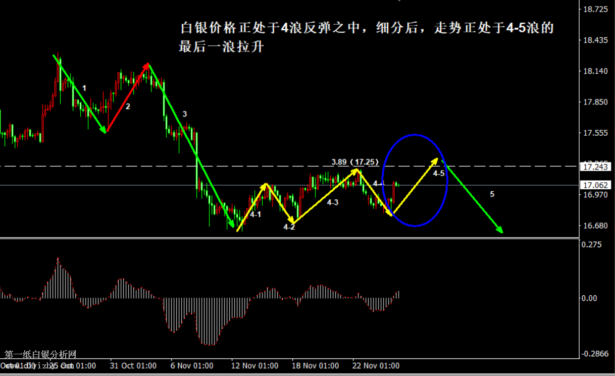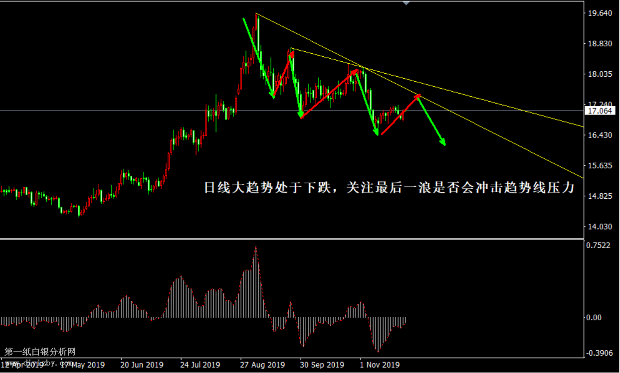 今日下方關(guān)鍵支撐3.8(16.8)、3.75(16.6)、3.72(16.5)。今日上方關(guān)鍵阻力3.9(17.3)、3.93(17.45)、3.98(17.65)。 提示:技術(shù)僅僅是基于概率論和統(tǒng)計學(xué)的一種綜合分析手段,絕非預(yù)測。所以技術(shù)分析是在考慮做好止損的情況下去博取大概率事件,投資不可過于迷信技術(shù)分析。(短線操作請一定做好止損,一旦被損,代表分析師基于概率和統(tǒng)計的技術(shù)分析不適用于當(dāng)前行情) 另外,由于紙白銀價格是國際銀價換算而來,而換算過程中涉及到人民幣對美元匯率的變化,即使在國際銀價不變化的情況下,如果人民幣貶值或升值,也會導(dǎo)致紙白銀價格出現(xiàn)變動。因此,我們的分析只采用最新的國際銀價對應(yīng)的人民幣白銀價格,如與過去分析價格有出入, 投資者應(yīng)知曉其原因。 1、文中價格為紙白銀價格,括號內(nèi)為國際銀價,投資者可雙向參考。 2、以上價格為工商銀行買入價,即紙白銀低價。進倉點位要再加點差(各銀行點差不一),出倉則不要。 3、第一紙白銀給出的所有建議僅供投資者參考,不作為下單依據(jù),作者不持有白銀,也不計劃買入。觀點僅供參考,不構(gòu)成投資建議,風(fēng)險自擔(dān)。 4、北京時間09:00發(fā)布此文章。 5、上一交易日白銀價格分析情況:(11月26日)白銀短線應(yīng)關(guān)注信號點 中間點位不宜急于追單