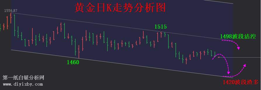 1:日K昨日翻出陽K上揚,隨機指標中軸附近鈍化運行,均線系統空頭排列,MACD指標粘合鈍化運行。暫時日K偏向橫向整理,橫向整理的區間是1450-1475這個區間。這個區間之內低吸高拋處理為主。下破1450-1445的支撐,黃金則會開啟新一輪的下跌趨勢,下探1400附近的買盤第二階段支撐。