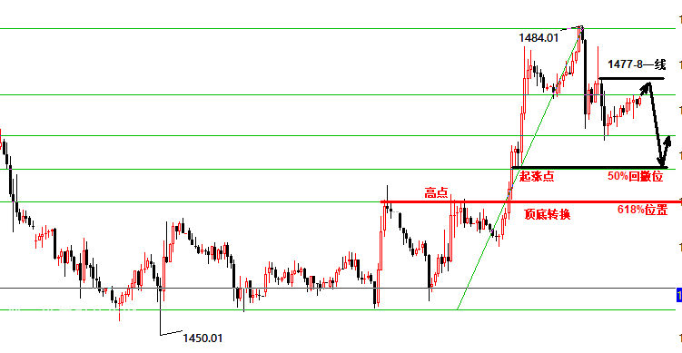 大致的區間我們卡在1468-1478走一個10美金的窄幅震蕩,日線以探底回升來報收。