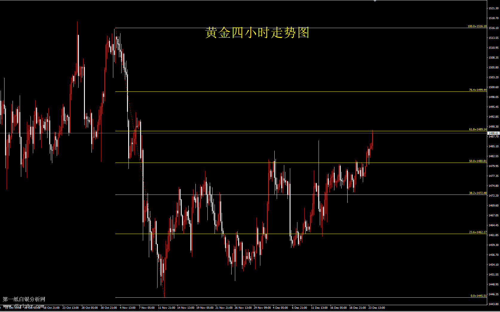 交易上以從順勢為王,把握節奏,黃金今天早上上破1486關口基本是我們昨天說的耍賴式的上破,市場在圣誕節假日時間段上破短期很難有持續性的拉升,這樣沒辦法看到太高的上升空間。如果上破是趨勢的開始,操作上不在意短期波動,以波段中長線跟蹤倒是可以入市持倉。亞盤黃金沖高四小時收盤在1489價位,錄得一根光頭陽線,形態上看仍繼續有利于多頭,在結合昨天日線錄得的K線形態,今天下方1484附近還是有低多機會。