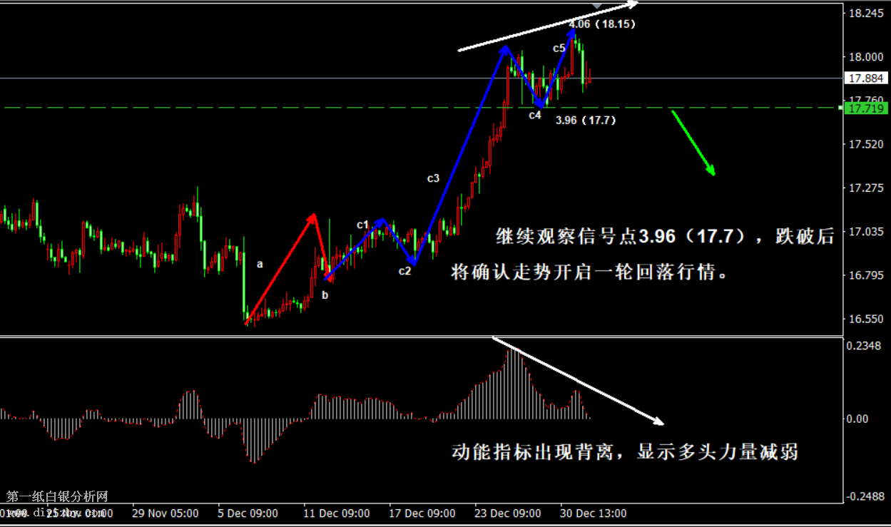 今日下方關(guān)鍵支3.96(17.7)、3.91(17.5)、3.87(17.3)、3.82(17.1)、3.78(16.9)。今日上方關(guān)鍵阻力4.06(18.15)、4.09(18.3)、4.12(18.45)。 提示:技術(shù)僅僅是基于概率論和統(tǒng)計學的一種綜合分析手段,絕非預測。所以技術(shù)分析是在考慮做好止損的情況下去博取大概率事件,投資不可過于迷信技術(shù)分析。(短線操作請一定做好止損,一旦被損,代表分析師基于概率和統(tǒng)計的技術(shù)分析不適用于當前行情) 另外,由于紙白銀價格是國際銀價換算而來,而換算過程中涉及到人民幣對美元匯率的變化,即使在國際銀價不變化的情況下,如果人民幣貶值或升值,也會導致紙白銀價格出現(xiàn)變動。因此,我們的分析只采用最新的國際銀價對應(yīng)的人民幣白銀價格,如與過去分析價格有出入, 投資者應(yīng)知曉其原因。 1、文中價格為紙白銀價格,括號內(nèi)為國際銀價,投資者可雙向參考。 2、以上價格為工商銀行買入價,即紙白銀低價。進倉點位要再加點差(各銀行點差不一),出倉則不要。 3、第一紙白銀給出的所有建議僅供投資者參考,不作為下單依據(jù),作者不持有白銀,也不計劃買入。觀點僅供參考,不構(gòu)成投資建議,風險自擔。 4、北京時間09:00發(fā)布此文章。 5、上一交易日白銀價格分析情況:(12月31日)白銀C浪反彈還未結(jié)束 依靠"信號點"指引方向