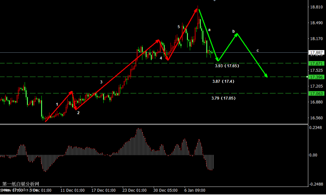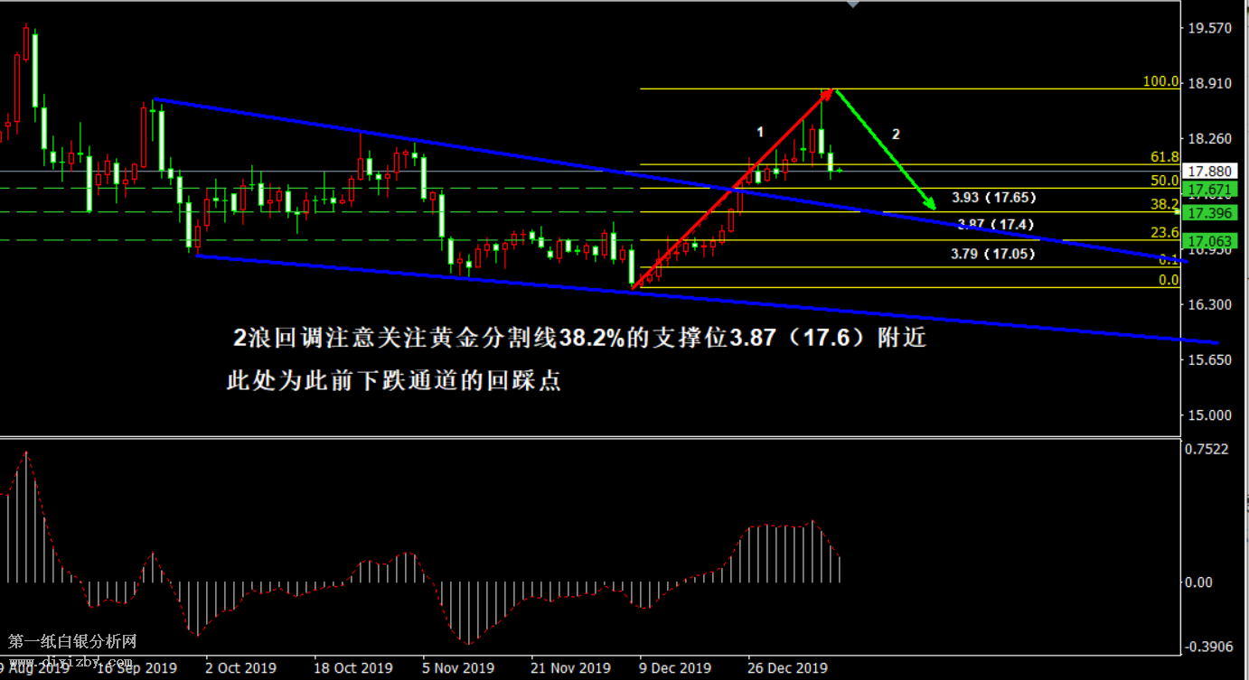 今日下方關(guān)鍵支3.93(17.85)、3.87(17.4)、3.79(17.05)。今日上方關(guān)鍵阻力4.21(18.9)、4.37(19.6)。 提示:技術(shù)僅僅是基于概率論和統(tǒng)計學的一種綜合分析手段,絕非預測。所以技術(shù)分析是在考慮做好止損的情況下去博取大概率事件,投資不可過于迷信技術(shù)分析。(短線操作請一定做好止損,一旦被損,代表分析師基于概率和統(tǒng)計的技術(shù)分析不適用于當前行情) 另外,由于紙白銀價格是國際銀價換算而來,而換算過程中涉及到人民幣對美元匯率的變化,即使在國際銀價不變化的情況下,如果人民幣貶值或升值,也會導致紙白銀價格出現(xiàn)變動。因此,我們的分析只采用最新的國際銀價對應的人民幣白銀價格,如與過去分析價格有出入, 投資者應知曉其原因。 1、文中價格為紙白銀價格,括號內(nèi)為國際銀價,投資者可雙向參考。 2、以上價格為工商銀行買入價,即紙白銀低價。進倉點位要再加點差(各銀行點差不一),出倉則不要。 3、第一紙白銀給出的所有建議僅供投資者參考,不作為下單依據(jù),作者不持有白銀,也不計劃買入。觀點僅供參考,不構(gòu)成投資建議,風險自擔。 4、北京時間09:00發(fā)布此文章。 5、上一交易日白銀價格分析情況:(1月9日)白銀短線或開啟2浪回調(diào) 中期看漲形態(tài)仍不變