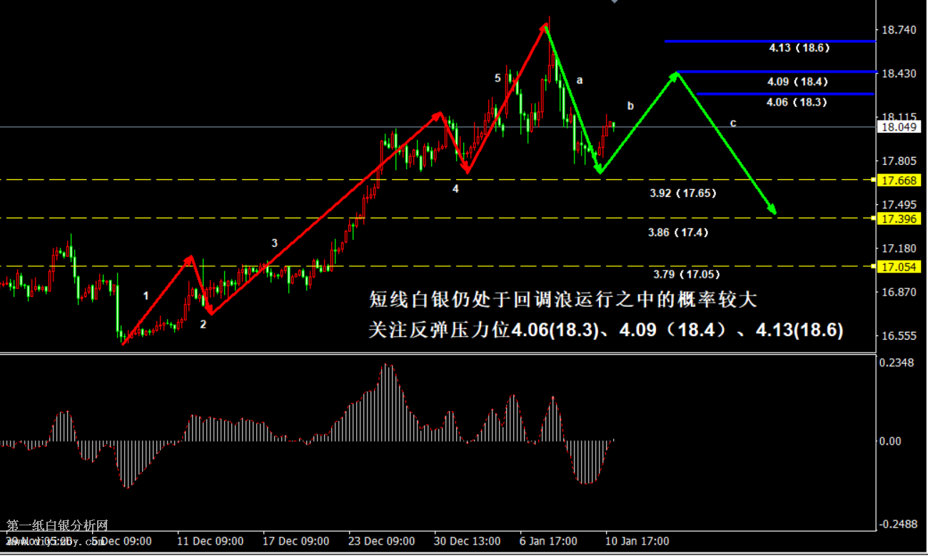 今日下方關(guān)鍵支3.92(17.65)、3.86(17.4)、3.79(17.05)。今日上方關(guān)鍵阻力4.06(18.3)、4.09(18.4)、4.13(18.6)、4.21(18.9)、4.37(19.6)。 提示:技術(shù)僅僅是基于概率論和統(tǒng)計(jì)學(xué)的一種綜合分析手段,絕非預(yù)測(cè)。所以技術(shù)分析是在考慮做好止損的情況下去博取大概率事件,投資不可過(guò)于迷信技術(shù)分析。(短線操作請(qǐng)一定做好止損,一旦被損,代表分析師基于概率和統(tǒng)計(jì)的技術(shù)分析不適用于當(dāng)前行情) 另外,由于紙白銀價(jià)格是國(guó)際銀價(jià)換算而來(lái),而換算過(guò)程中涉及到人民幣對(duì)美元匯率的變化,即使在國(guó)際銀價(jià)不變化的情況下,如果人民幣貶值或升值,也會(huì)導(dǎo)致紙白銀價(jià)格出現(xiàn)變動(dòng)。因此,我們的分析只采用最新的國(guó)際銀價(jià)對(duì)應(yīng)的人民幣白銀價(jià)格,如與過(guò)去分析價(jià)格有出入, 投資者應(yīng)知曉其原因。 1、文中價(jià)格為紙白銀價(jià)格,括號(hào)內(nèi)為國(guó)際銀價(jià),投資者可雙向參考。 2、以上價(jià)格為工商銀行買(mǎi)入價(jià),即紙白銀低價(jià)。進(jìn)倉(cāng)點(diǎn)位要再加點(diǎn)差(各銀行點(diǎn)差不一),出倉(cāng)則不要。 3、第一紙白銀給出的所有建議僅供投資者參考,不作為下單依據(jù),作者不持有白銀,也不計(jì)劃買(mǎi)入。觀點(diǎn)僅供參考,不構(gòu)成投資建議,風(fēng)險(xiǎn)自擔(dān)。 4、北京時(shí)間09:00發(fā)布此文章。 5、上一交易日白銀價(jià)格分析情況:(1月10日)白銀回調(diào)暫未結(jié)束 關(guān)注支撐位止跌形態(tài)和信號(hào)